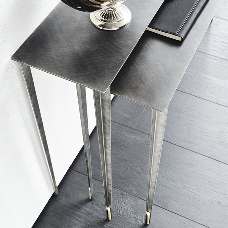 Pair of consoles in two heights, structure in Brushed Brass, Brushed Bronze or Brushed Grey lacquered steel and brass details.