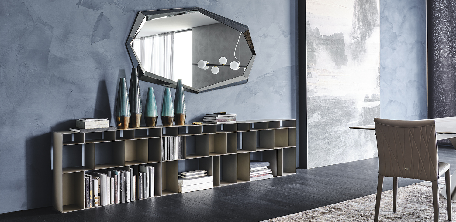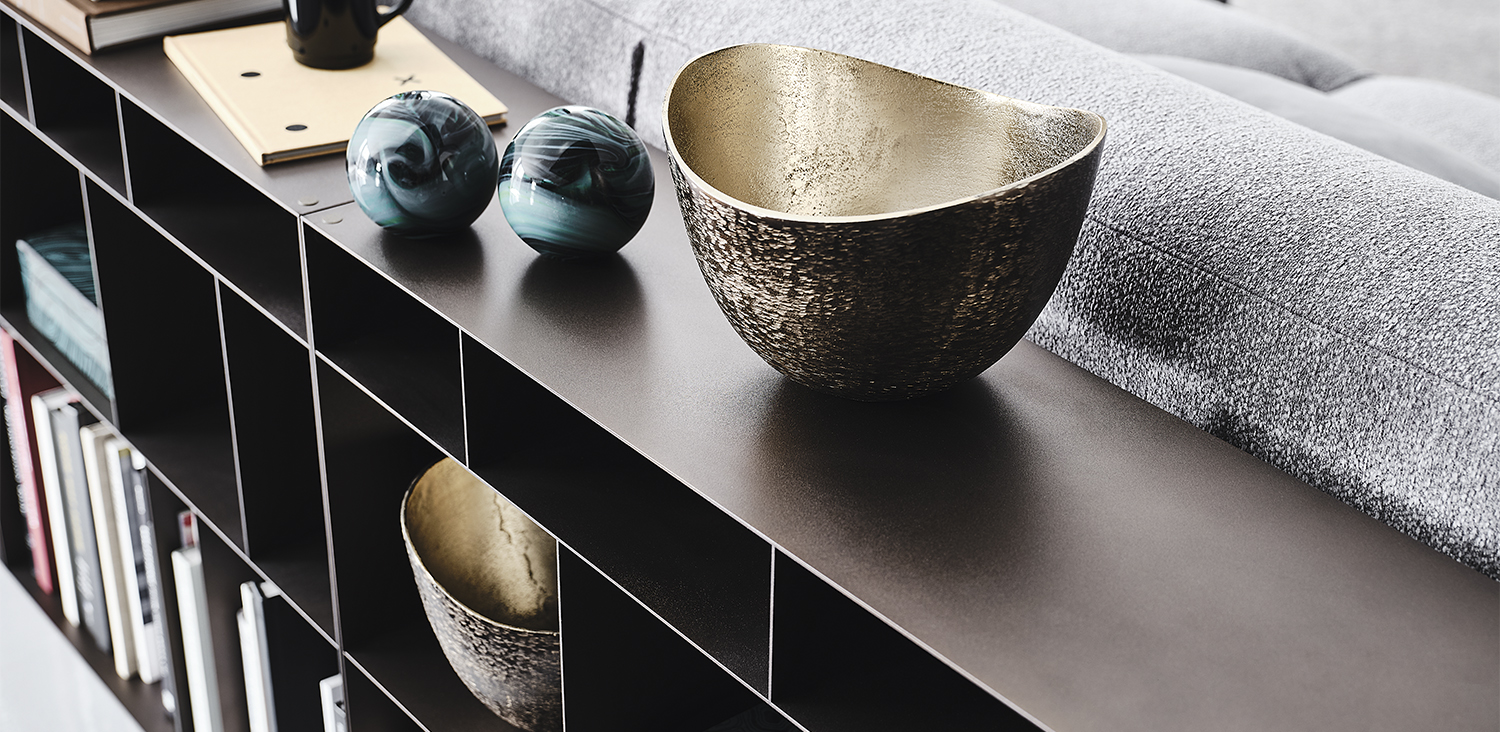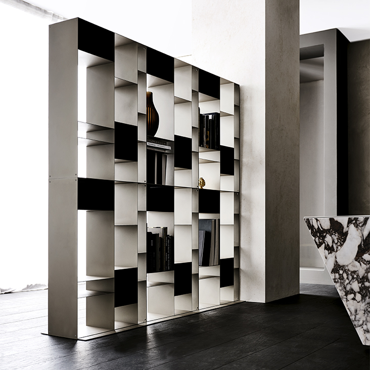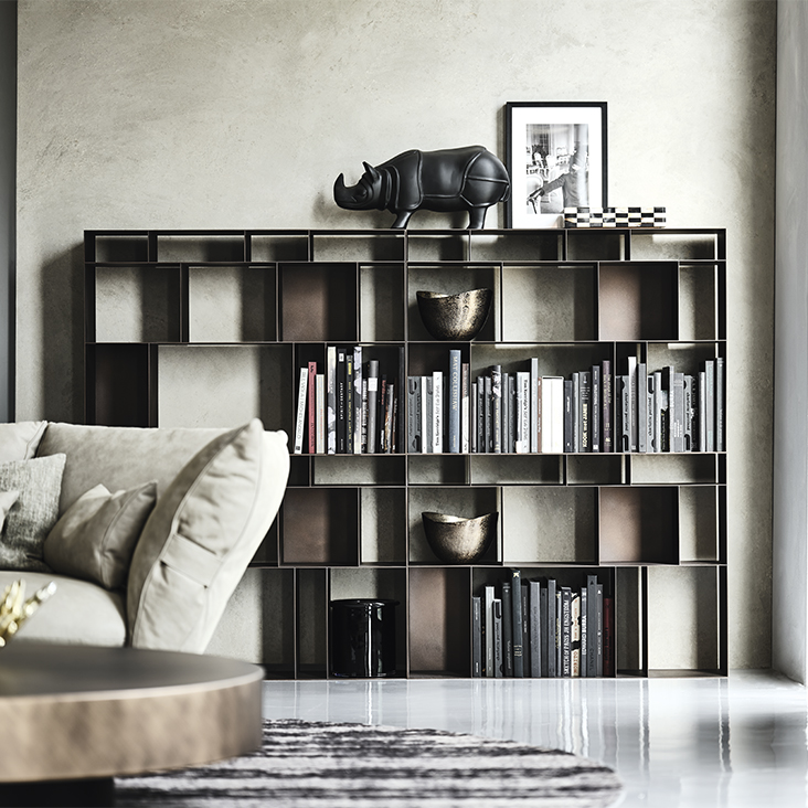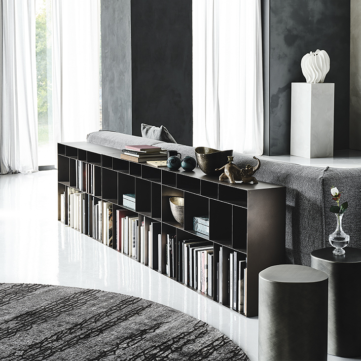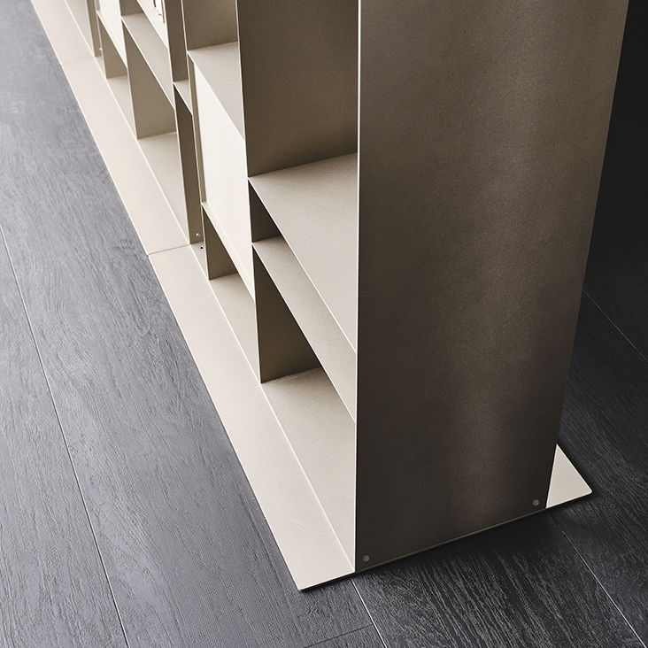 Bookcase in titanium (GFM11) or bronze (GFM18) embossed lacquered steel, each unit can be set up side by side or stackable. Wall anchorage is necessary if the optional ballast is not fixed.