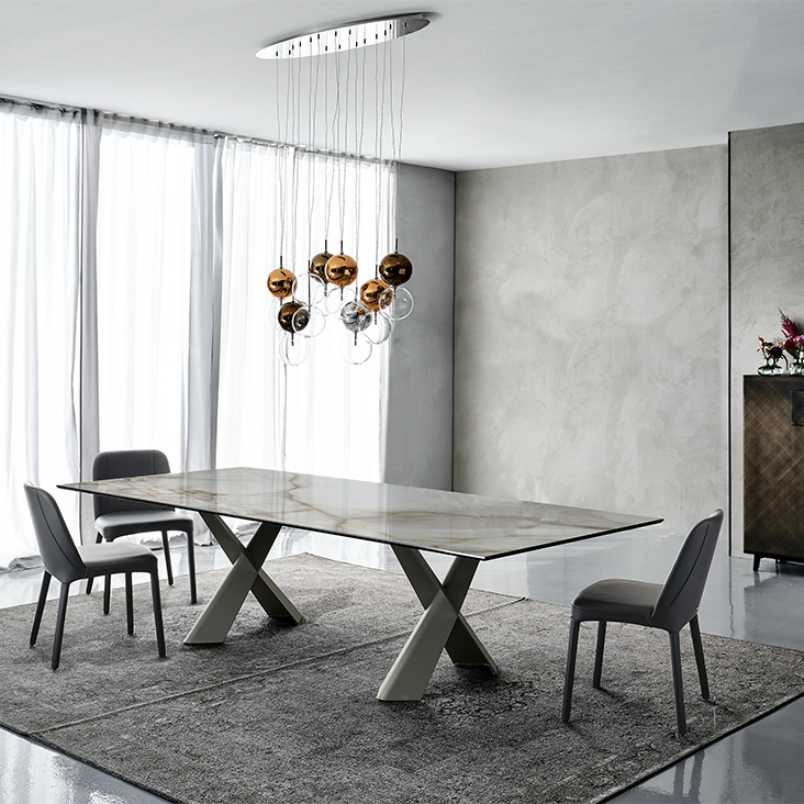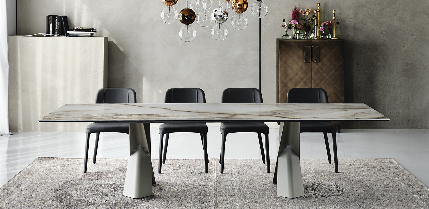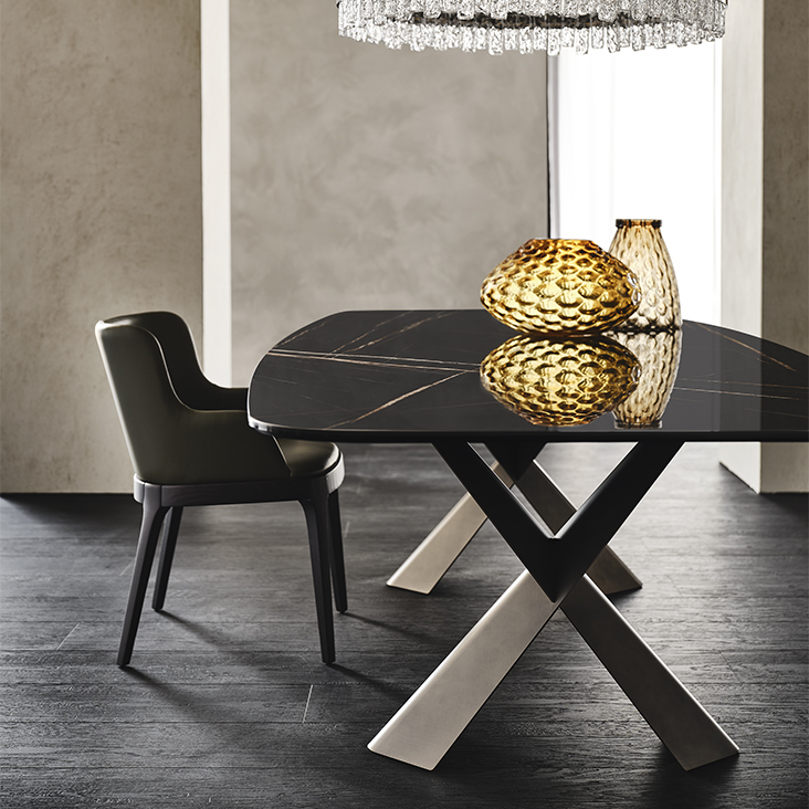 Table with base in titanium (GFM11), bronze (GFM18), graphite (GFM69) or black (GFM73) embossed lacquered steel, Brushed Bronze or Brushed Grey lacquered steel. Top in ceramic Marmi Alabastro (KM02), Supreme (KM03), Ardesia (KM04), matt Golden Calacatta (KM05), glossy Golden Calacatta (KM06), matt Portoro (KM07), glossy Portoro (KM08), glossy Sahara Noir (KM09), Emperador (KM10), Makalu (KM11), Breccia (KM12) or Arenal (KM13).