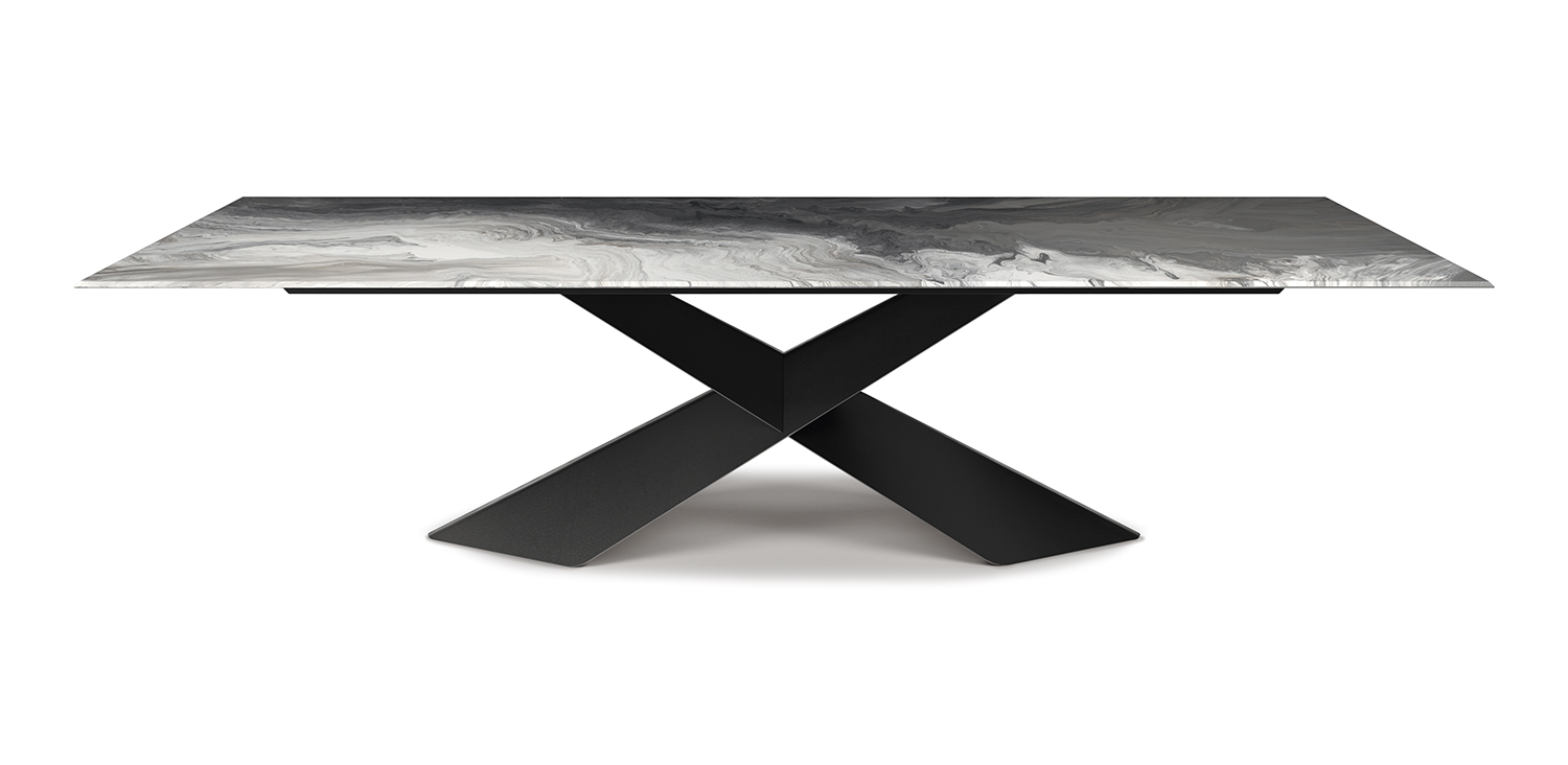 Table with base in titanium (GFM11), bronze (GFM18), graphite (GFM69) or black (GFM73) embossed lacquered steel, Brushed Bronze or Brushed Grey. Top 12mm thick in extra clear bevelled glass with artistic decorative printing in two different colours (CY01, CY02).
