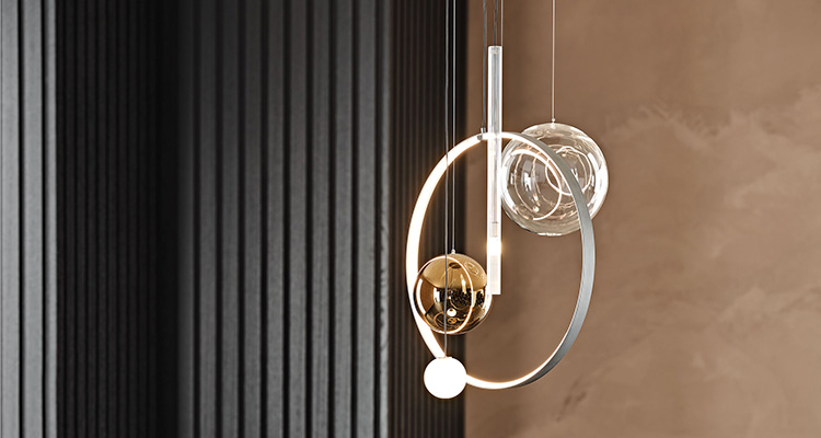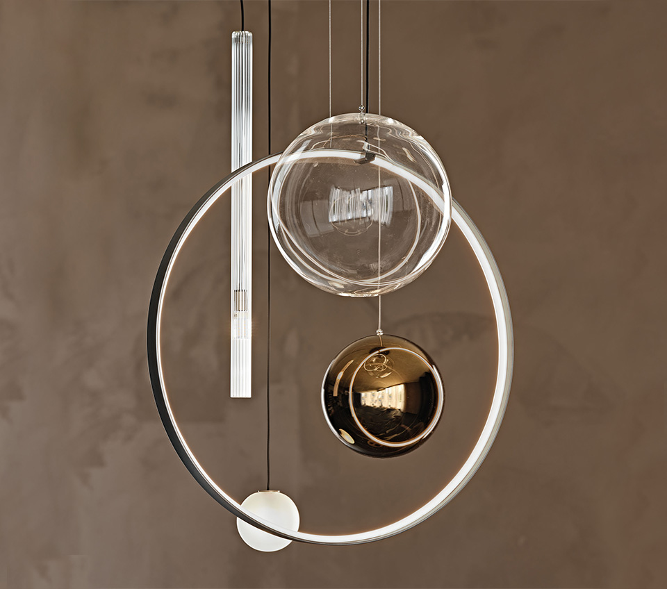Like satellites, lampshades of different sizes and colours gravitate around the steel circumference, illuminated internally by LED lights. Other elements are animated by light, such as the opaque glass sphere and the ribbed stem. The apparently random composition is the result of a precise study of weights and volumes to find the perfect balance for this modern lamp that gives the room a sophisticated, high-end allure.