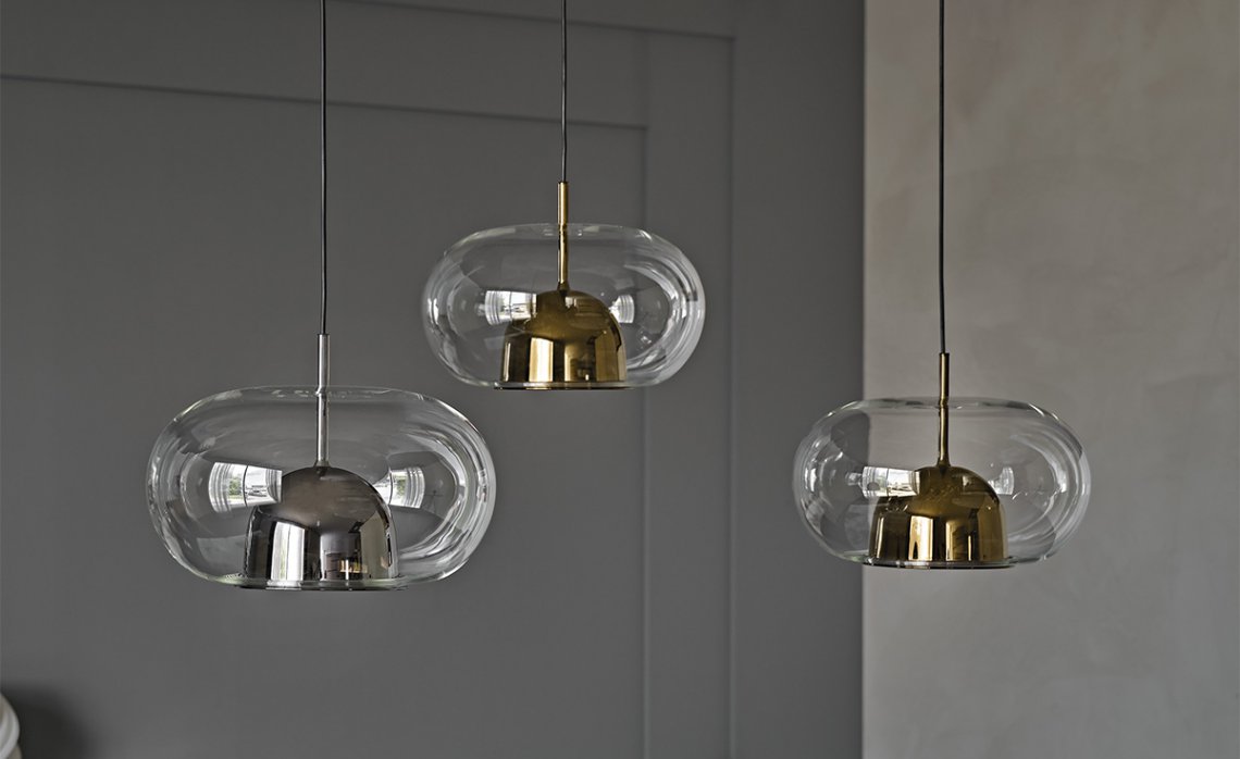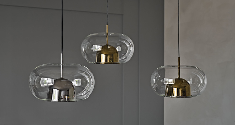 The Coimbra suspended glass lamp consists of a transparent sphere, flattened in the centre, which houses a painted glass bell inside. Everything about this design lamp, from its soft curves to the combination of complementary, transparent and reflective finishes, contributes to decorating a space with harmony and lightness, even when the light is off. Coimbra is suitable for lighting a dining room, with an asymmetrical composition on multiple heights, descending gently at a side table next to a sofa, or lighting a comfortable reading corner.