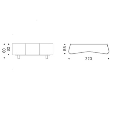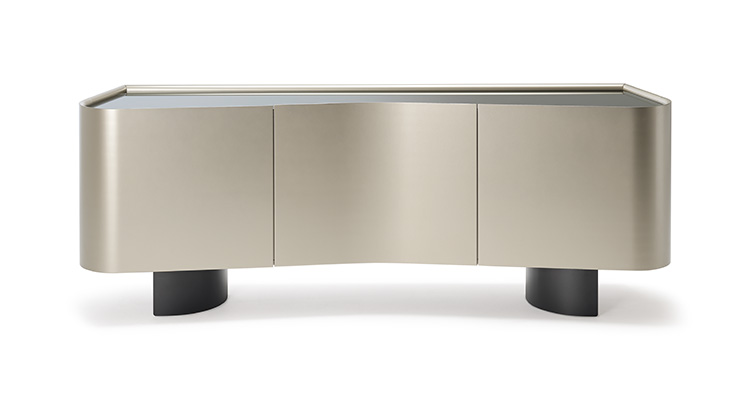 Perfectly symmetrical, it is characterised by a rounded shape with a recess in the centre. Its external doors, when opened, unfold like the wings of a seagull, revealing the interior enriched by fine glass tops. The lack of excess in the finishes is balanced by the unique shape, while the mirrored top embellishes this modern lacquered wood sideboard and makes it worthy of a sophisticated design living room.