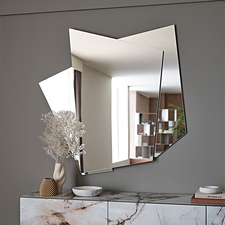 It is a mirror on three levels, with a vertical shape that can therefore comfortably reflect the human figure. The model is angular with a punchy aesthetic and seems to hold together three large fragments of a previously intact mirror. When equipped with LED light, facing the wall as a light frame, its decorative function increases further.