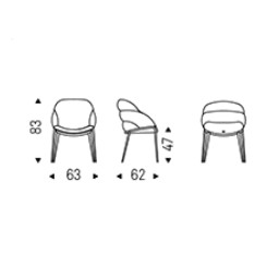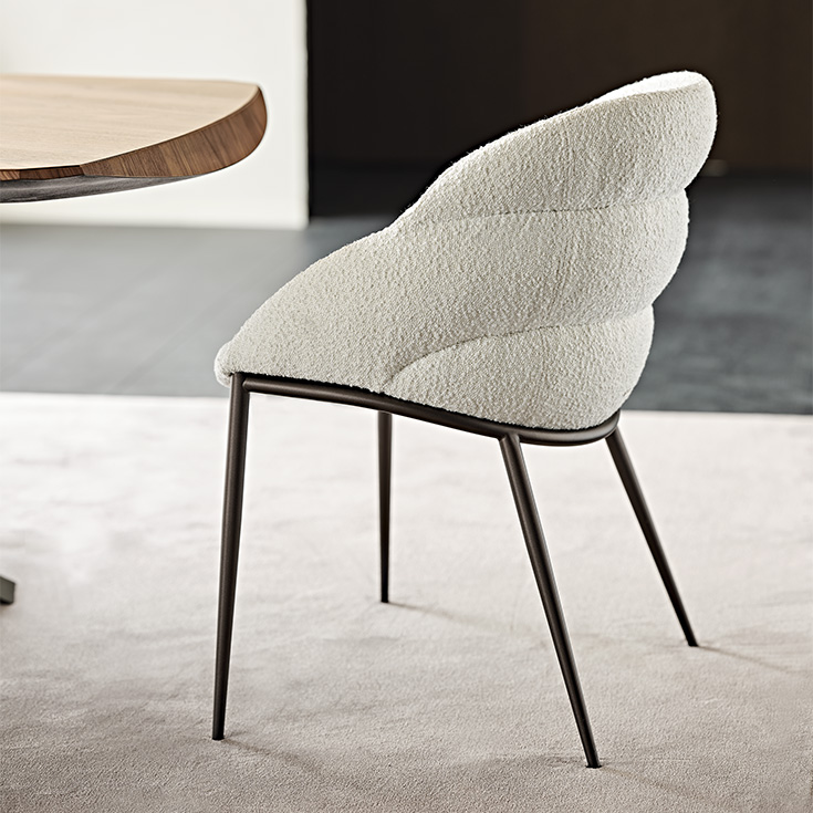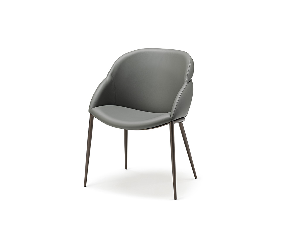 The Camilla armchair is the perfect example of a chair with padded armrests that completes a room with the delicacy and sensuality you want in a residential setting. The horizontal seams on the back of the backrest produce three padded protrusions that end uniformly and very fluidly in the armrest. In the lower part of the backrest, the deep structure and the connection of the legs emphasise the softness of the enveloping curves.