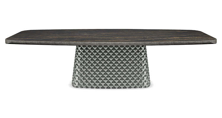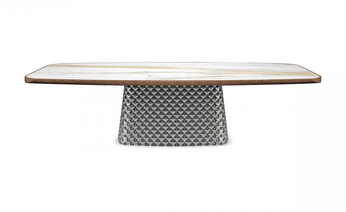 The central base consists of two finely worked plates of couture mirrored glass. The table creates a play of soft reflections, in which the surrounding objects and light sources reverberate. The glass is shaped with an unprecedented technique that gives the surface a three-dimensional effect like quilting on fabric. The table tops of the Atrium line range from wood to ceramics up to round tables in wood and ceramics combined.