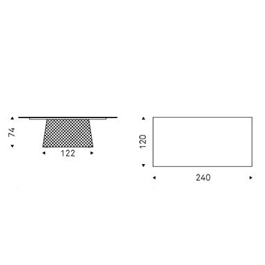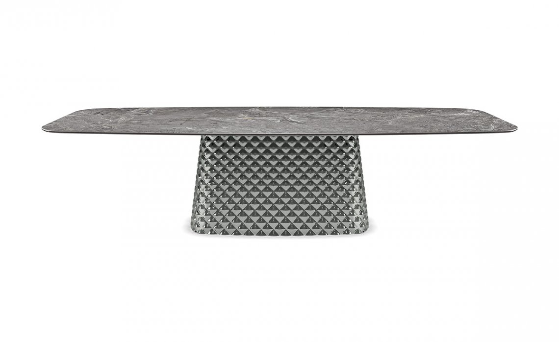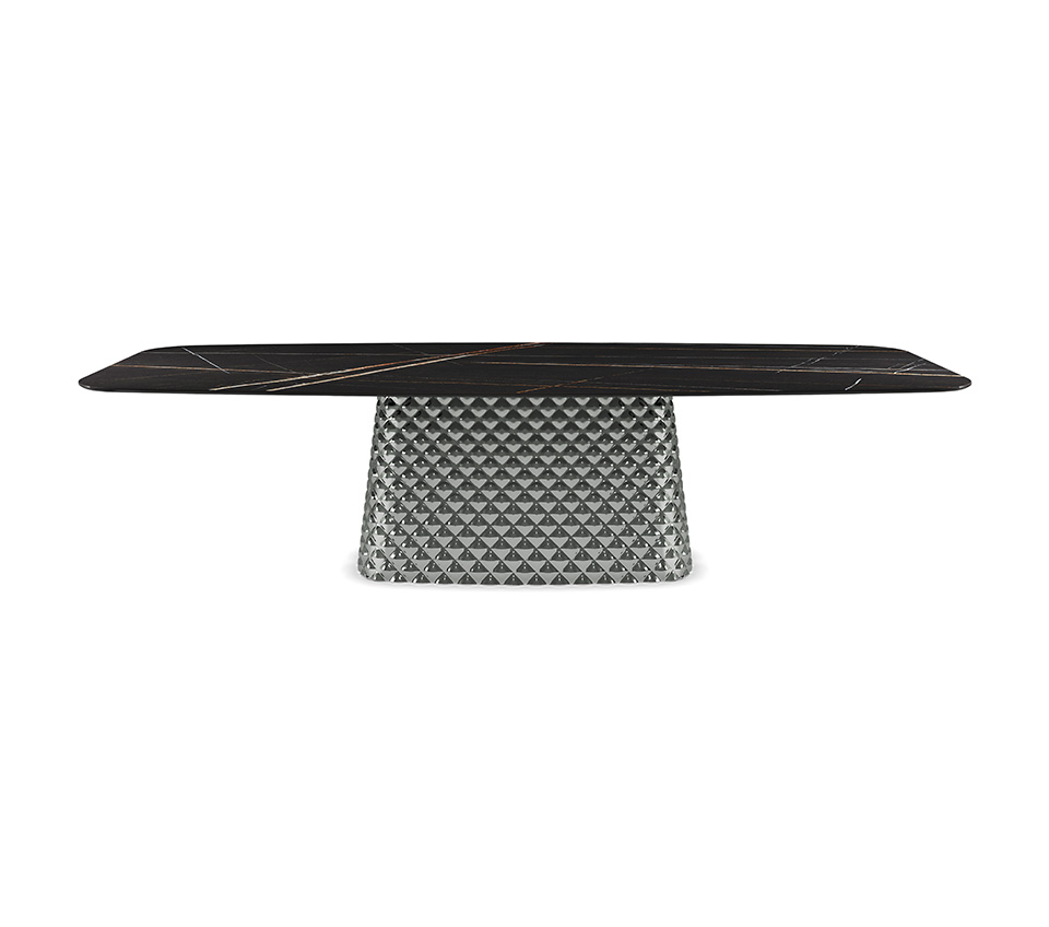 The central base consists of two finely worked plates of couture mirrored glass. The table creates a play of soft reflections, in which the surrounding objects and light sources reverberate. The glass is shaped with an unprecedented technique that gives the surface a three-dimensional effect like quilting on fabric. The table tops of the Atrium line range from wood to ceramics up to round tables in wood and ceramics combined.