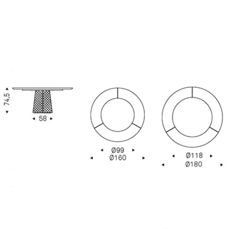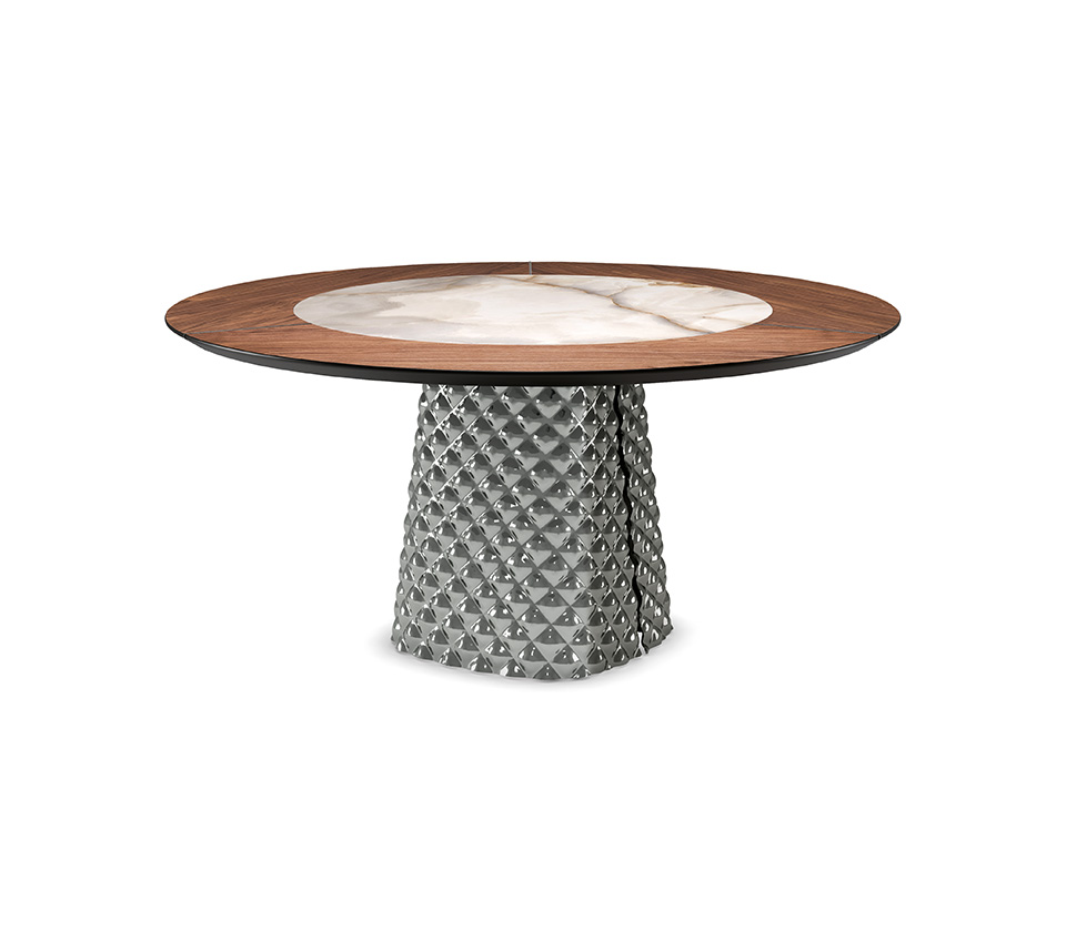 The central base consists of two finely worked plates of couture mirrored glass. The table creates a play of soft reflections, in which the surrounding objects and light sources reverberate. The glass is shaped with an unprecedented technique that gives the surface a three-dimensional effect like quilting on fabric. The table tops of the Atrium line range from wood to ceramics up to round tables in wood and ceramics combined.
