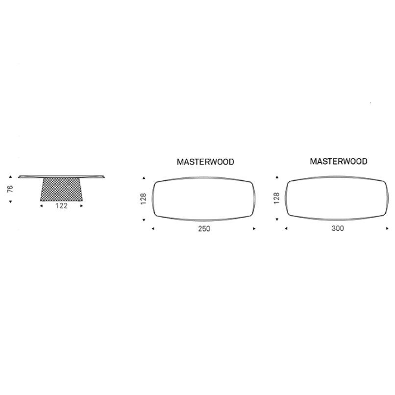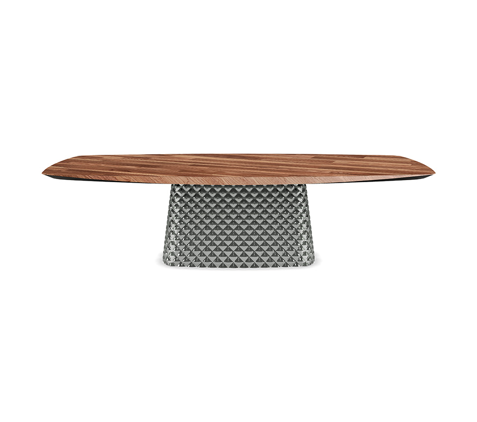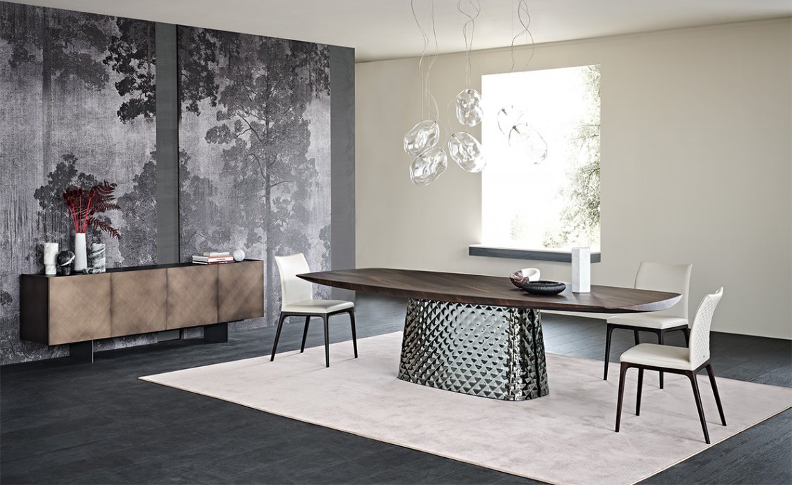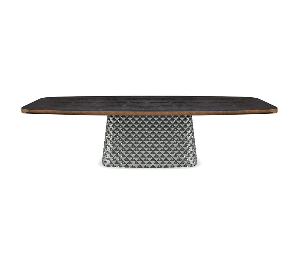 The central base consists of two finely worked plates of couture mirrored glass. The table creates a play of soft reflections, in which the surrounding objects and light sources reverberate. The glass is shaped with an unprecedented technique that gives the surface a three-dimensional effect like quilting on fabric. The table tops of the Atrium line range from wood to ceramics up to round tables in wood and ceramics combined.
