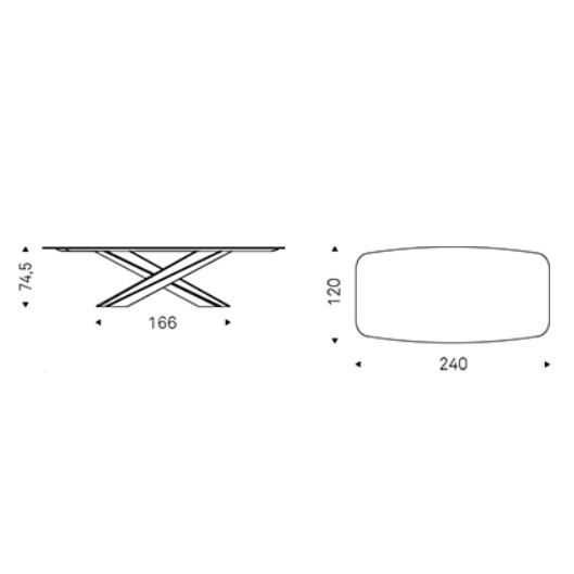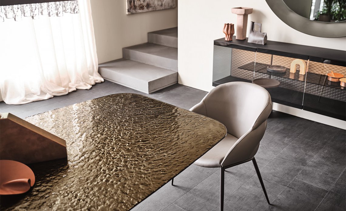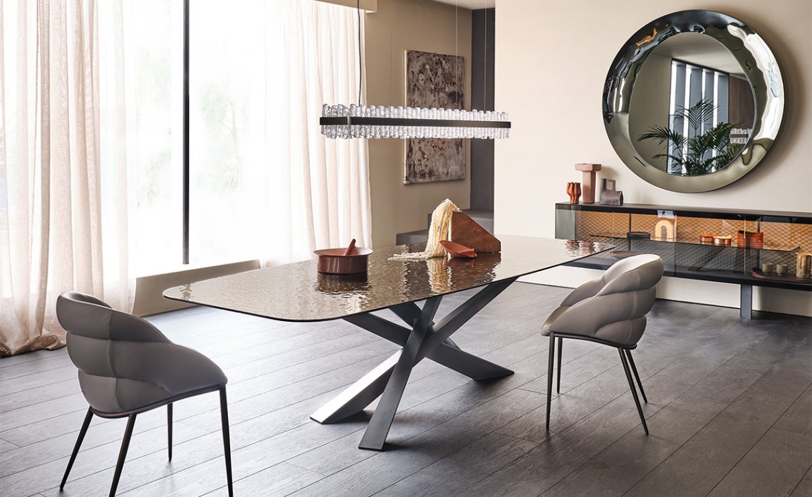 Four blades cut through the air and intersect each other, creating an energetic composition with an apparently irreproducible pattern. Each leg is designed with a T-section, which multiplies the opportunities for crossing and overlapping. The entire base is thus strengthened by a rhythmic chiaroscuro effect, in which the blind zones contrast with the metal portions struck by the light.The bold aesthetic, unafraid of attracting attention, extends to several variants. The standard model is made of transparent glass.