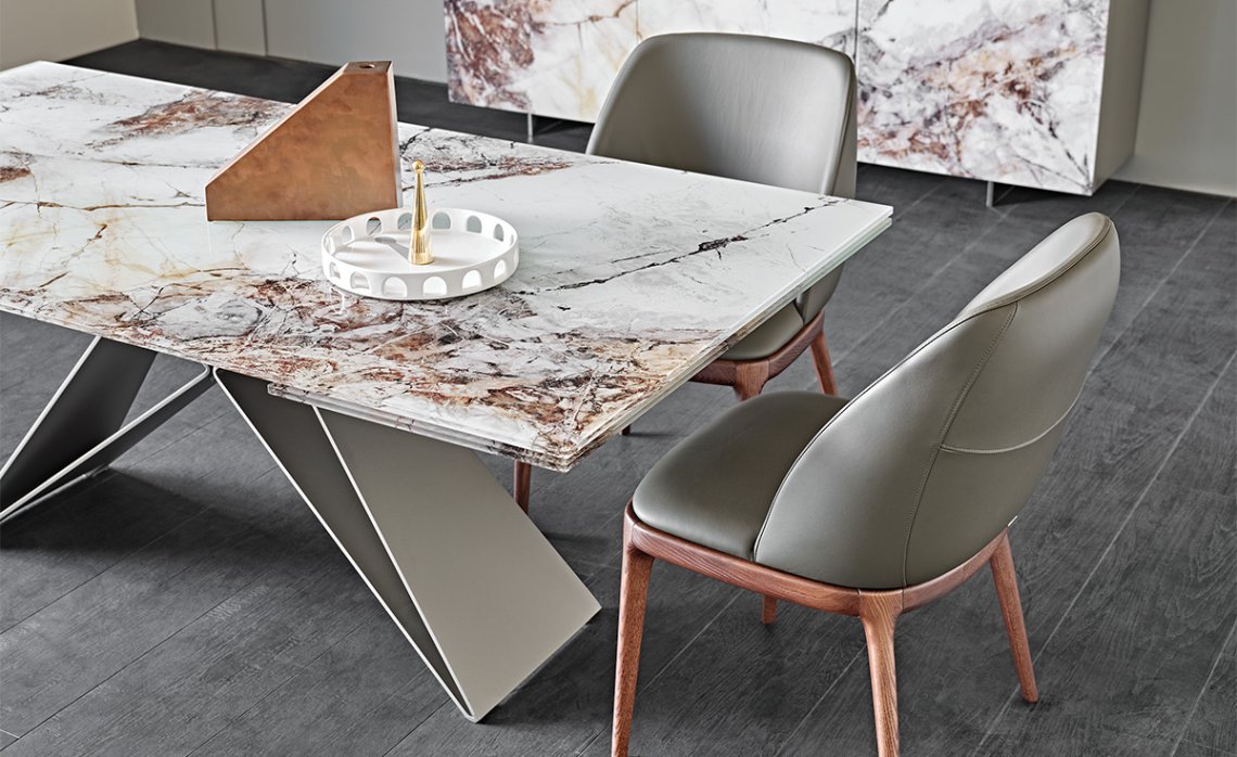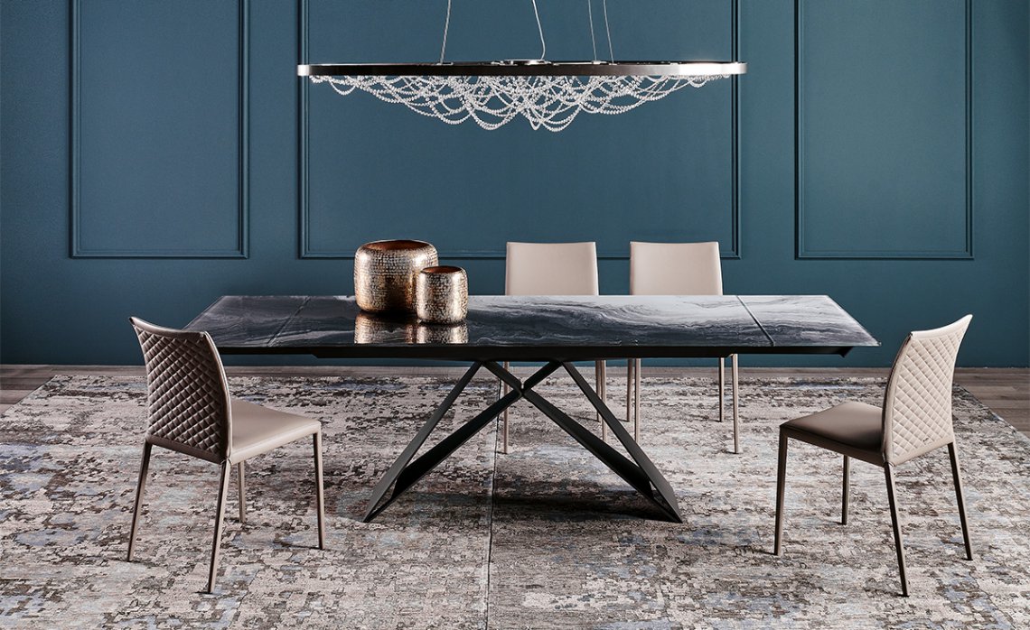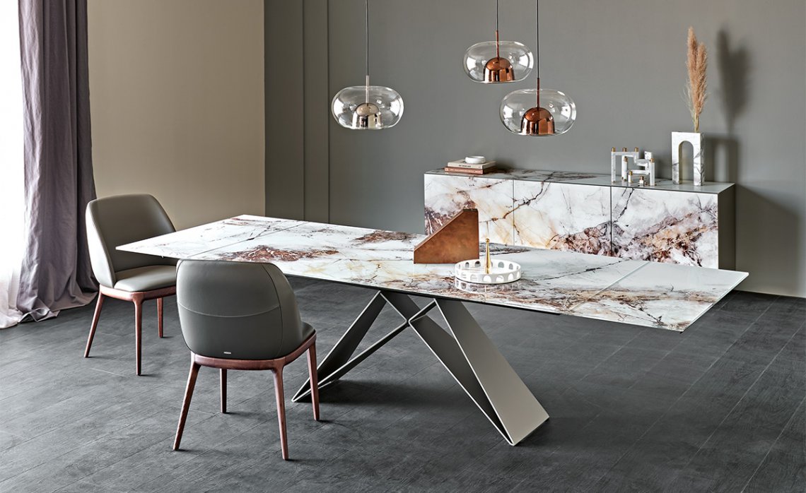 Customization is key to meet many design needs. You may choose between: Premier Crystalart and Premier Crystalart Drive glass tables, decorated with an artistic printing, the latter is an extendable glass table; Premier Keramik with a refined ceramic top, also available in the extendable table version Keramik Drive; Premier Wood and Premier Wood Drive, the first one with irregular edges, the second one with oblique regular edges. Premier design tables pay homage to the finest materials of Italian manufacturing and celebrate conviviality even in limited spaces.