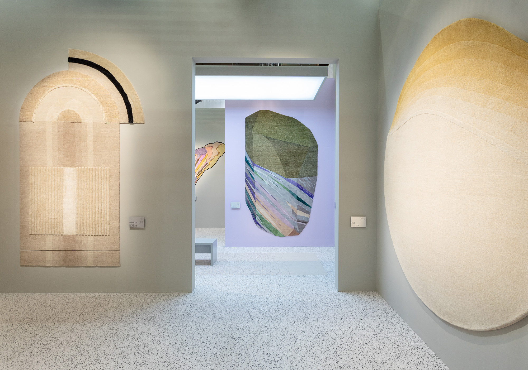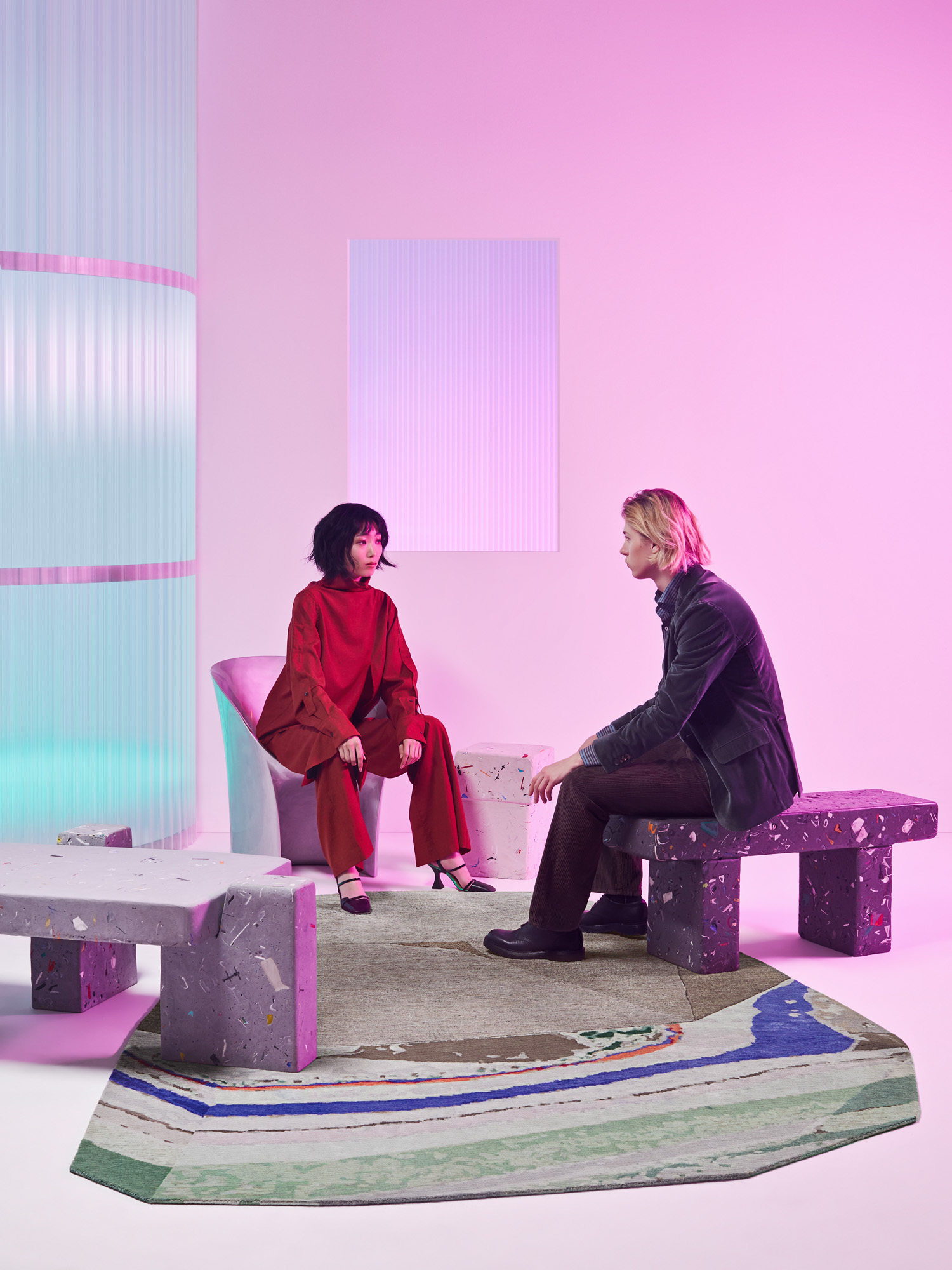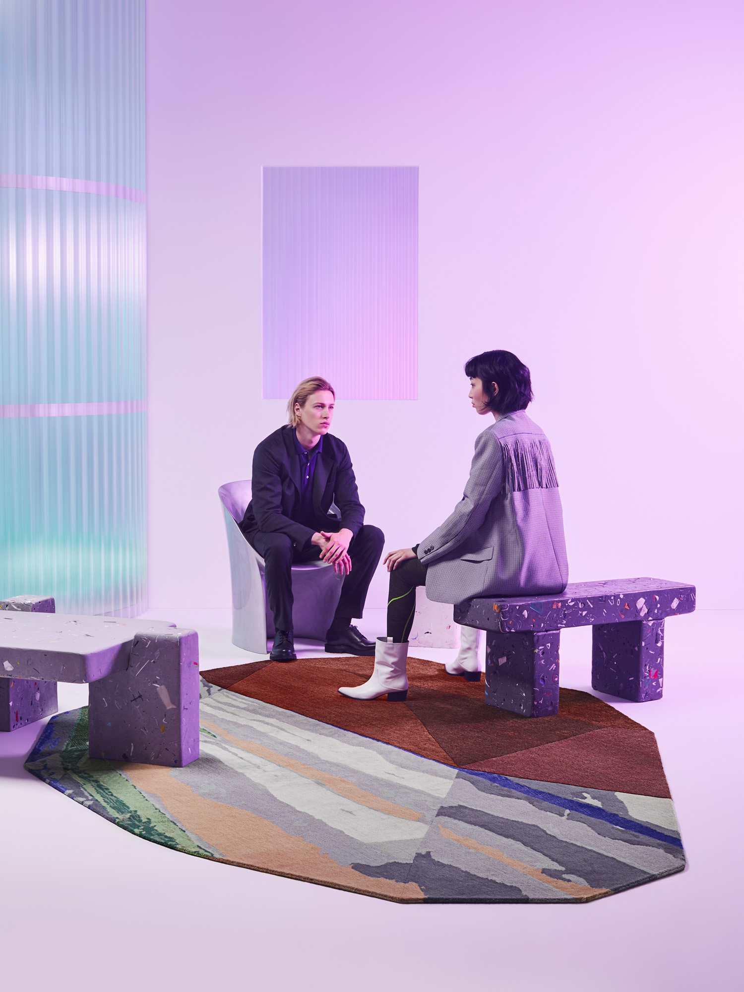 Fordite is a byproduct of the car manufacturing industry: a multicolored stratum of enamel automotive paint that has built up over time within the factory, which is then baked and polished until it resembles a jewel. Inspired by this material, Patricia Urquiola has integrated a similar approach to sustainability in the creation of these rugs. The Himalayan wool, pure silk and aloe used was sourced from the material excess left over from cc-tapis’s regular production process. The rugs maintain the same layered appearance as Fordite, recreated with recycled wool and accented with lurex threads.