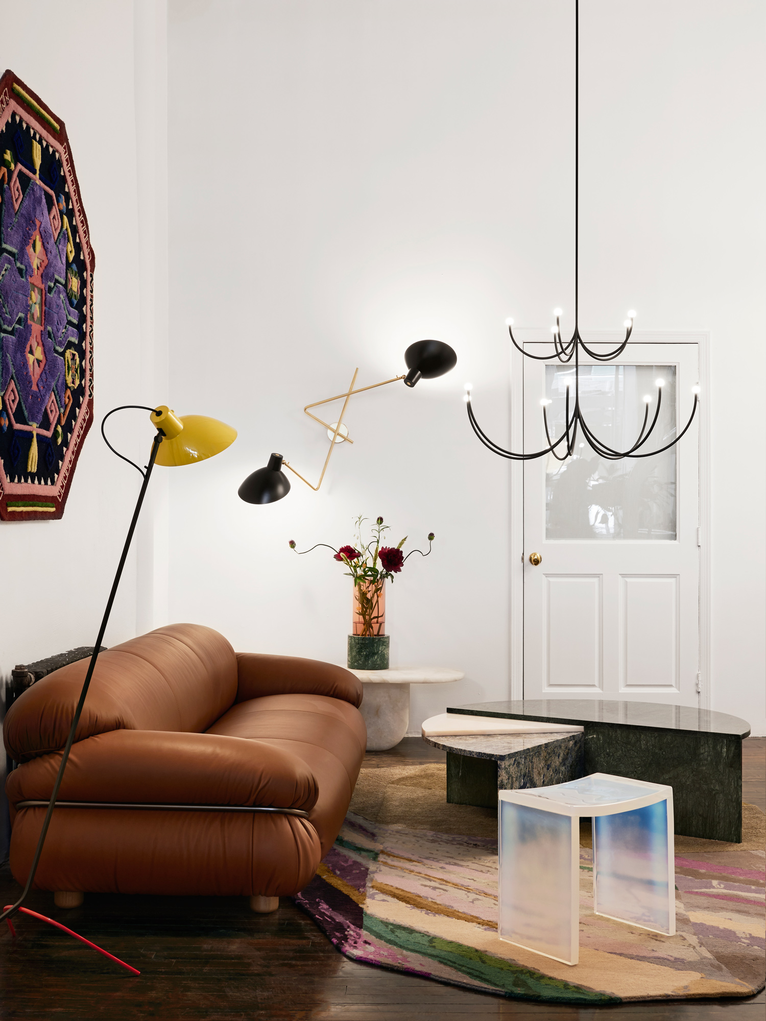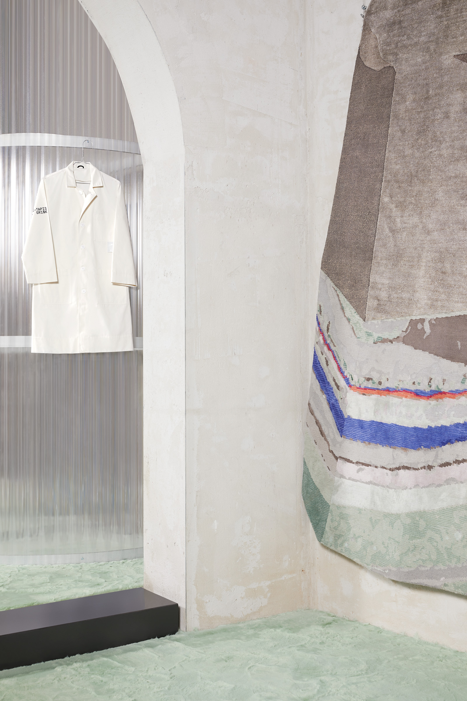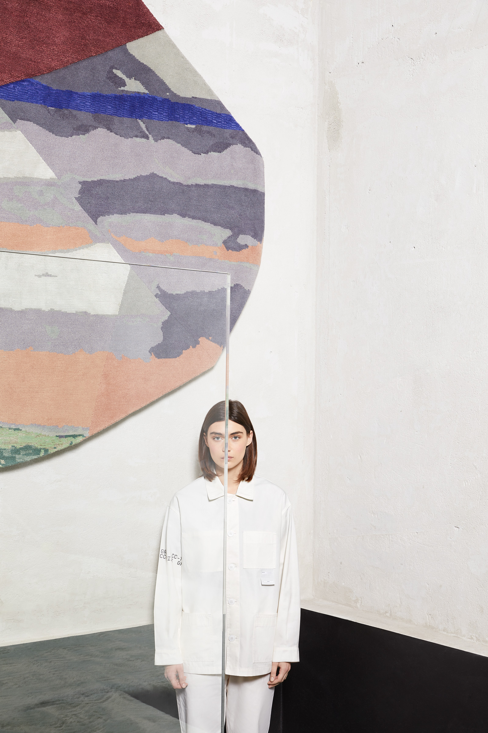 Fordite is a byproduct of the car manufacturing industry: a multicolored stratum of enamel automotive paint that has built up over time within the factory, which is then baked and polished until it resembles a jewel. Inspired by this material, Patricia Urquiola has integrated a similar approach to sustainability in the creation of these rugs. The Himalayan wool, pure silk and aloe used was sourced from the material excess left over from cc-tapis’s regular production process. The rugs maintain the same layered appearance as Fordite, recreated with recycled wool and accented with lurex threads.