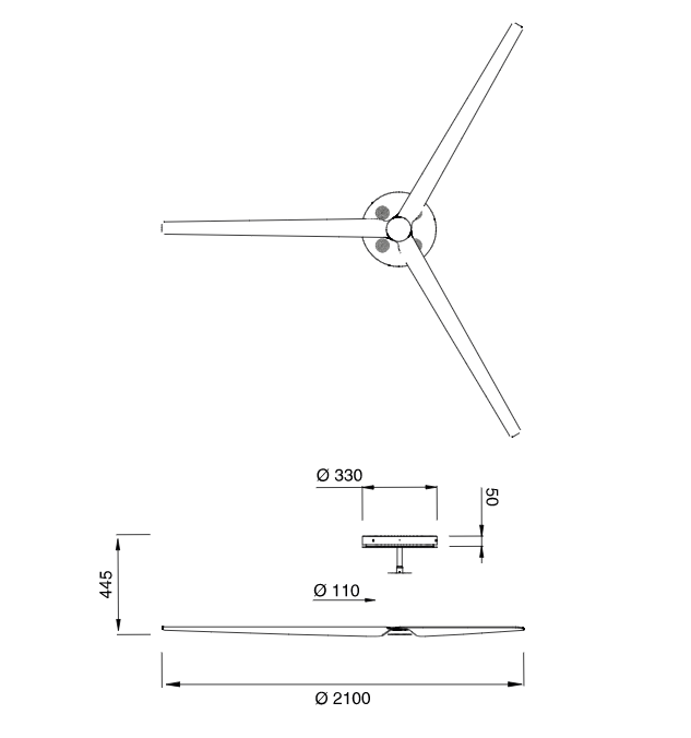 Ceiling fan (? 2100 mm) in AISI 316L stainless steel, with wood and carbon fiber blades, natural wood essence or lacquered. Integrated LED lighting, loudspeakers for Bluetooth connection and ionization/ozonation system technology, remote control included. Product suitable for indoor installation