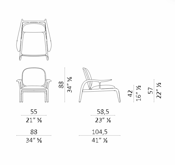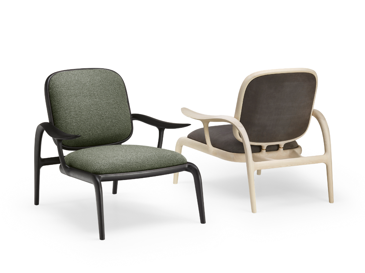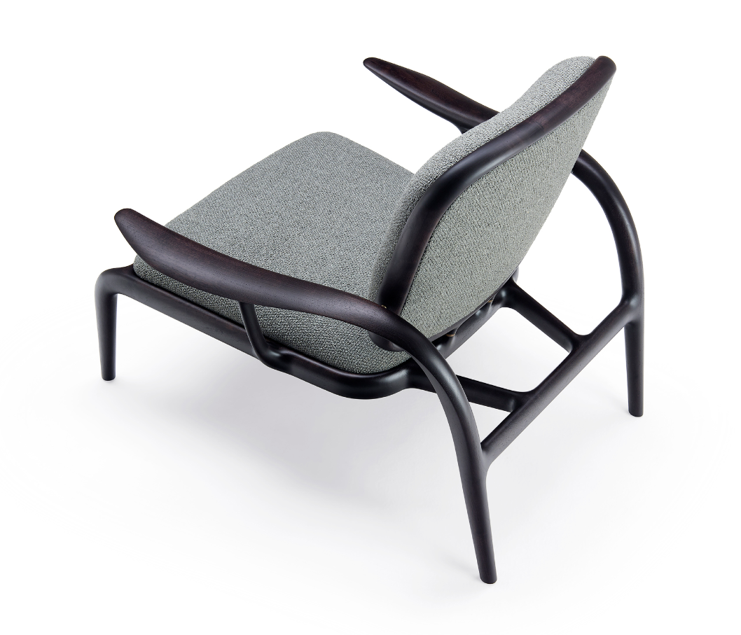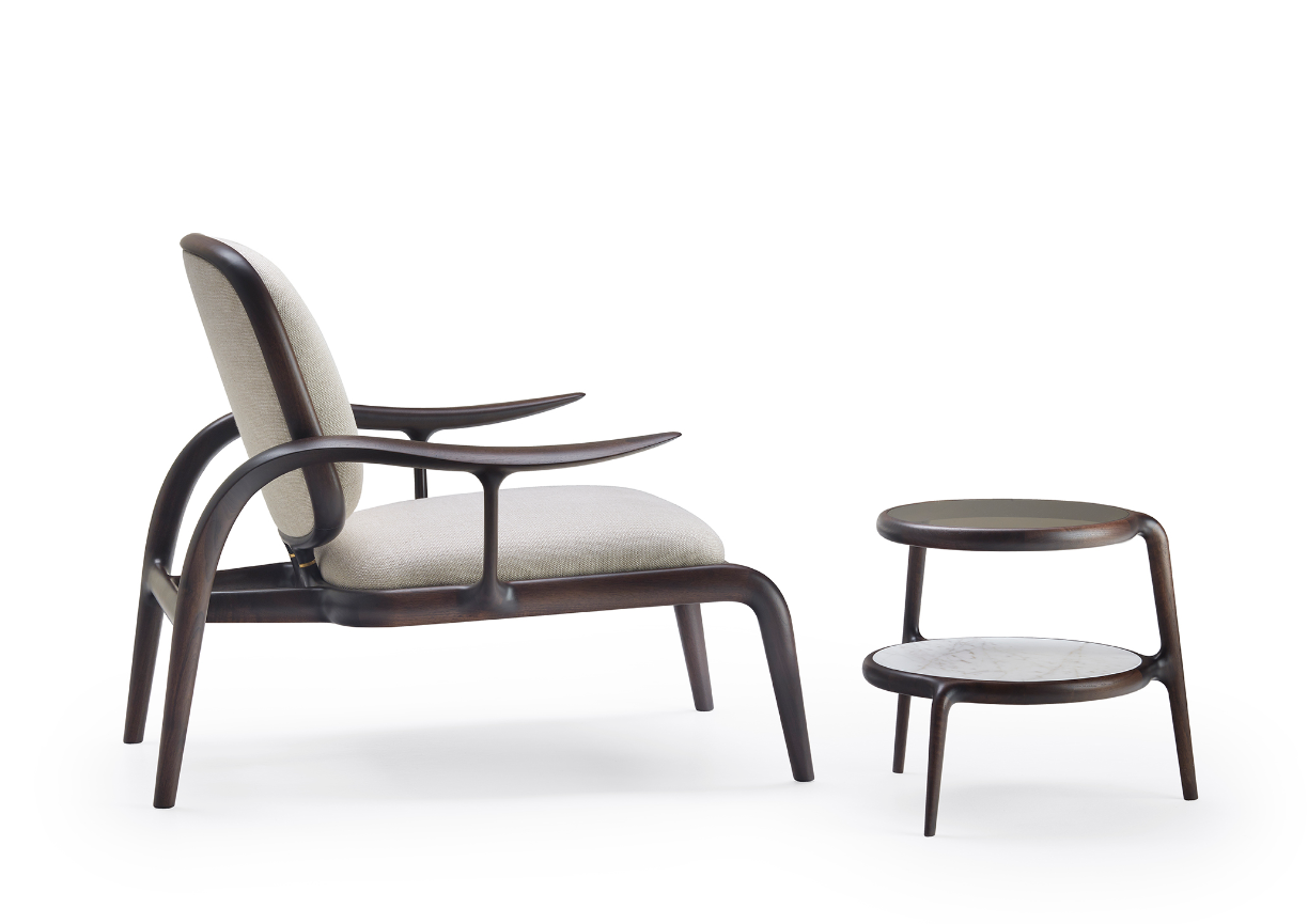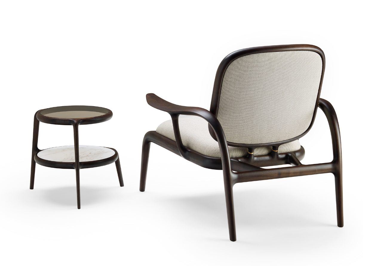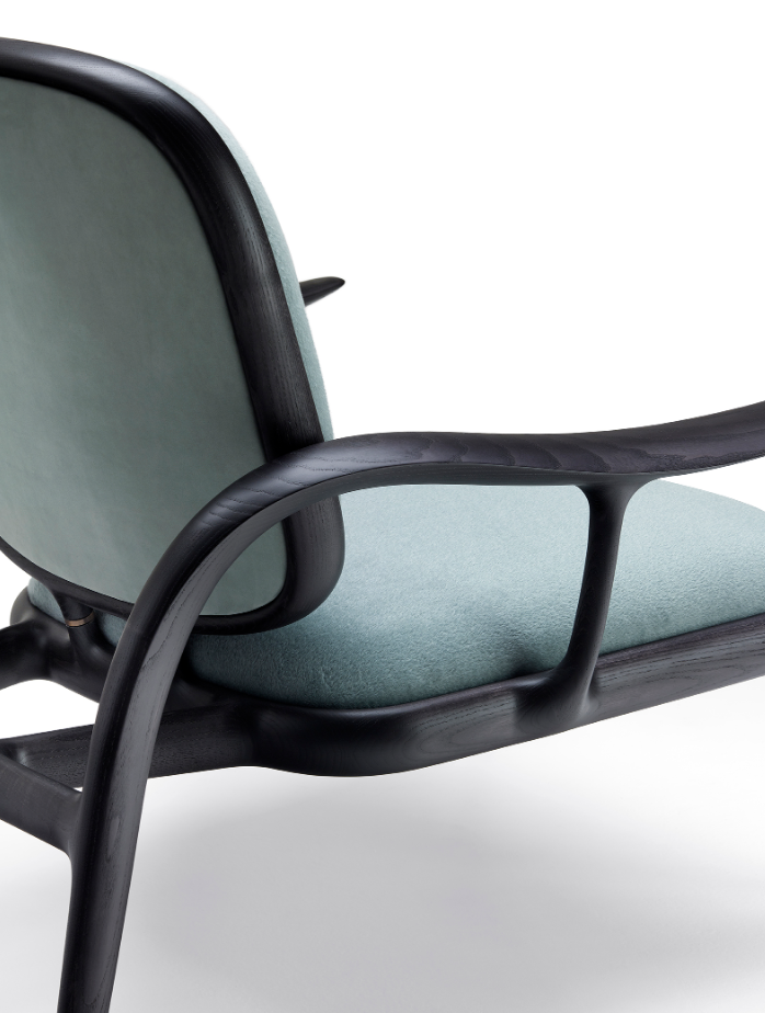 La struttura portante è sorretta da dei tiranti obliqui di sezione ellittica che fanno lavorare il legno in flessione, come fosse una balestra che sospende la seduta imbottita, mentre le sue superfici sono impreziosite da ricercate finiture lignee – in massello di noce o frassino – e da dettagli in ottone massiccio. Con un’ampia voluta che dal piede posteriore risale verso il bracciolo, si delinea un moto fluido ascendente, un segno iconico e inconfondibile.