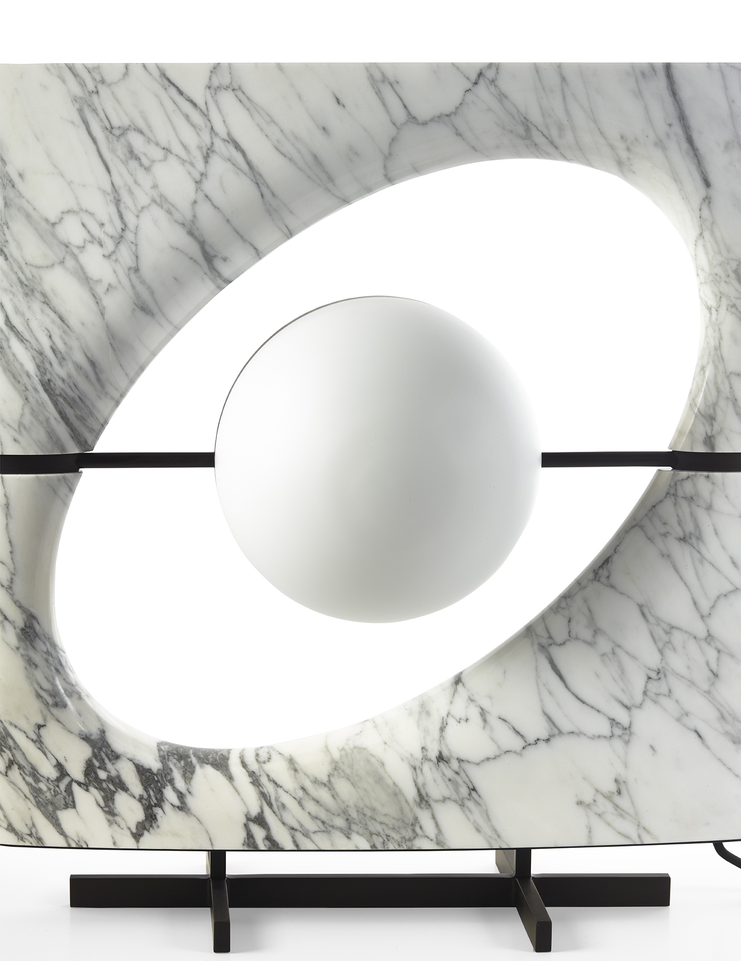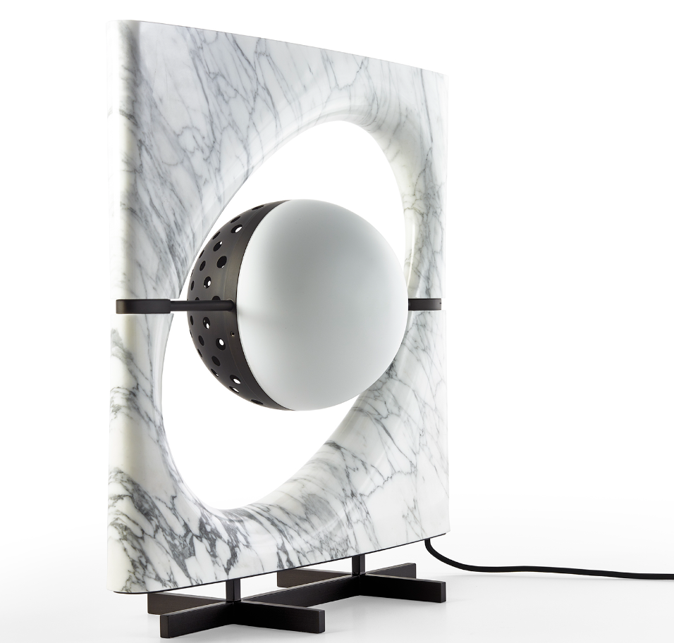 La lampada è composta da un corpo luminoso di forma sferica che sembra essere sospeso all’interno di uno spazio ellittico, proprio come Saturno mentre gravita nel suo sistema di anelli. Il paralume è formato da due semisfere: una in vetro sabbiato bianco che funge da fonte luminosa diffusa e una in metallo forato che proietta fasci di luce direzionali. Il corpo della lampada è composto da una cornice scolpita a partire da un blocco unico di pietra, accuratamente selezionato per esaltarne le venature naturali, disponibile in marmo Cervaiole. La lampada è sorretta da un piedistallo in metallo.