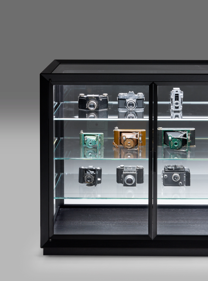 Wonderbox è come una teca museale per oggetti rari e speciali. Le credenze hanno una struttura semplice in legno massello di noce americano, con superfici trasparenti in vetro e telai sottili in alluminio bronzato. Le ante sono fissate con cerniere a bilico e presentano una maniglia inclinata. Le mensole interne, illuminate da LED, sono regolabili in posizione. è possibile aggiungere un pannello sul fondo decorato con carta da parati per ottenere una credenza d’appoggio oppure lasciare le superfici completamente in vetro per posizionare il mobile anche a centro stanza, protagonista della zona giorno.