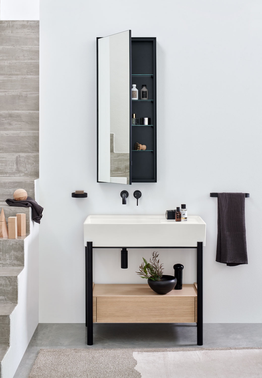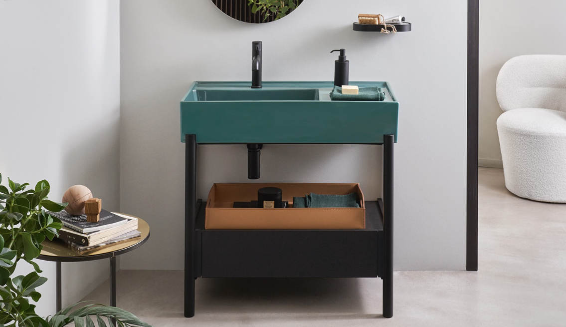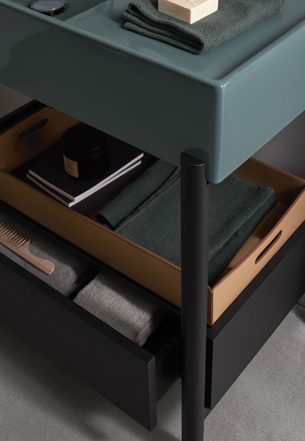 帶大盆和方便側架的陶瓷洗臉盆有多種飾面可供選擇,結構有涂漆鋼飾面或各種珍貴天然木飾面的木材,模塊化擱板或寬大的低抽屜,均采用漆木或在天然木質飾面中。所有這些都由不同尺寸的皮籃完成。