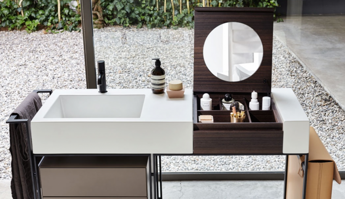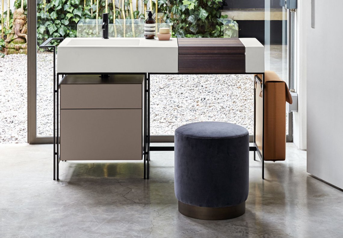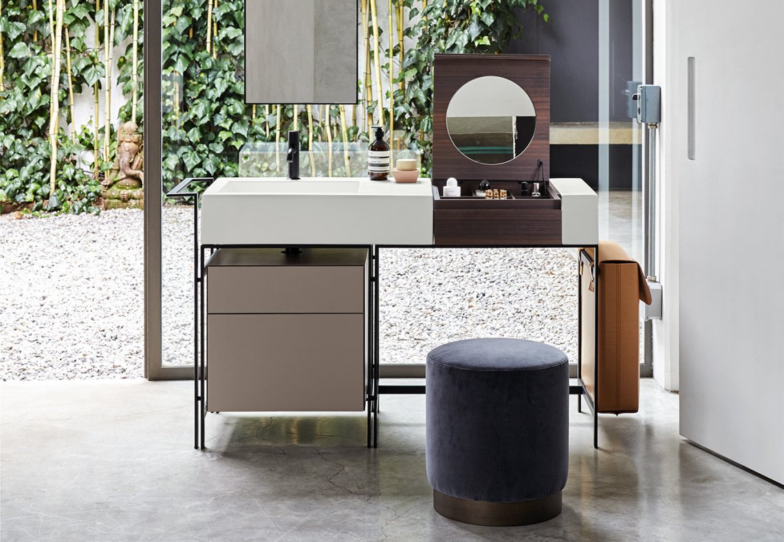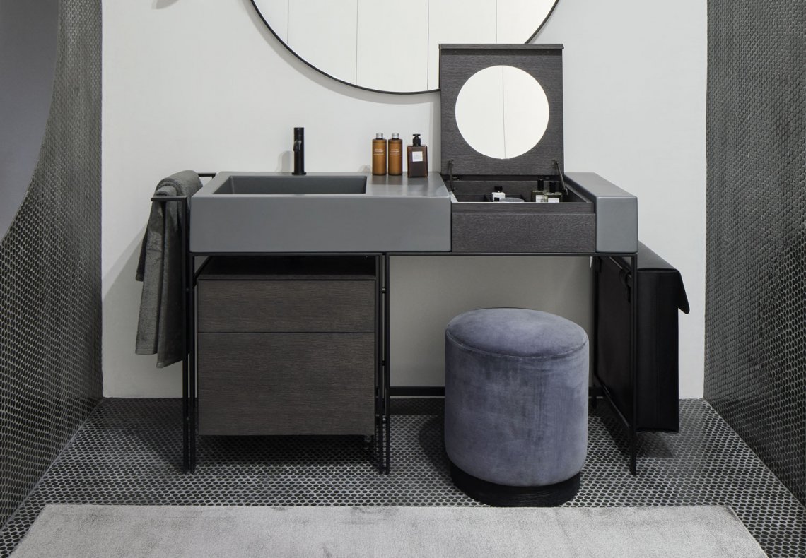 方便的洗臉盆的模塊化系統,配有多種飾面的大型側臺面,結合帶可拆卸架子的木制化妝元件,有 Terre di Cielo 顏色系列的漆飾面或覆蓋采用珍貴的天然木材飾面。涂漆鋼結構可以搭配實用的側毛巾架、漆木或木質飾面的抽屜單元以及舒適的側邊皮革袋。