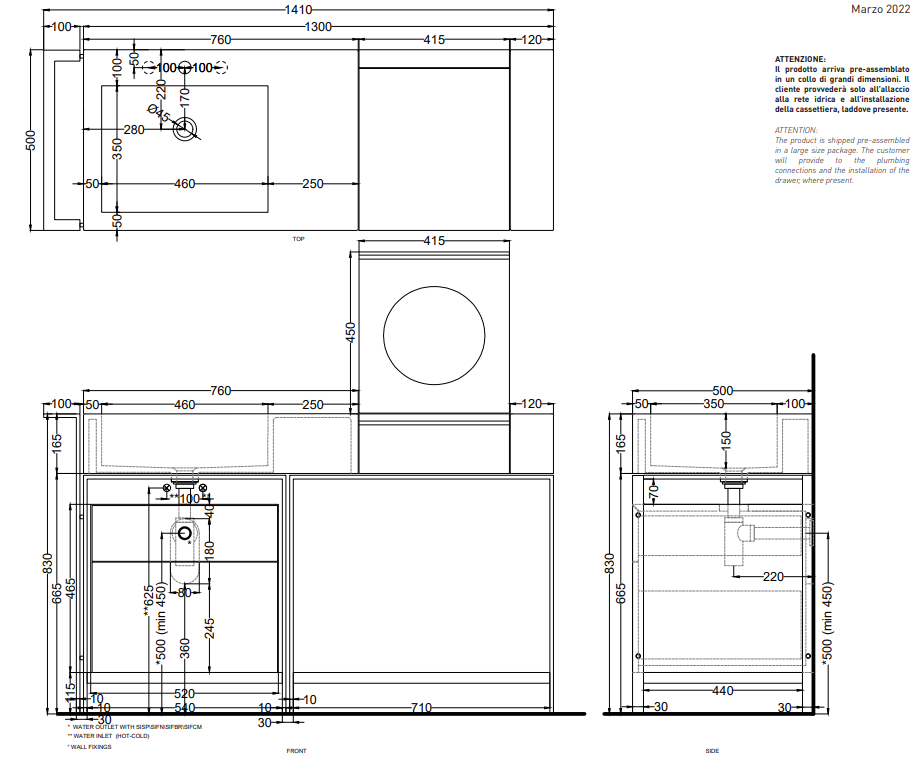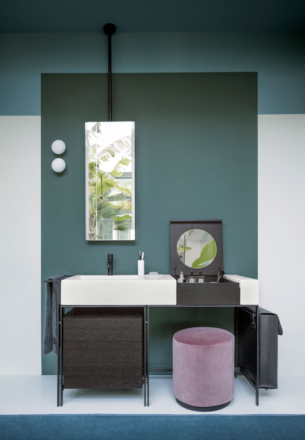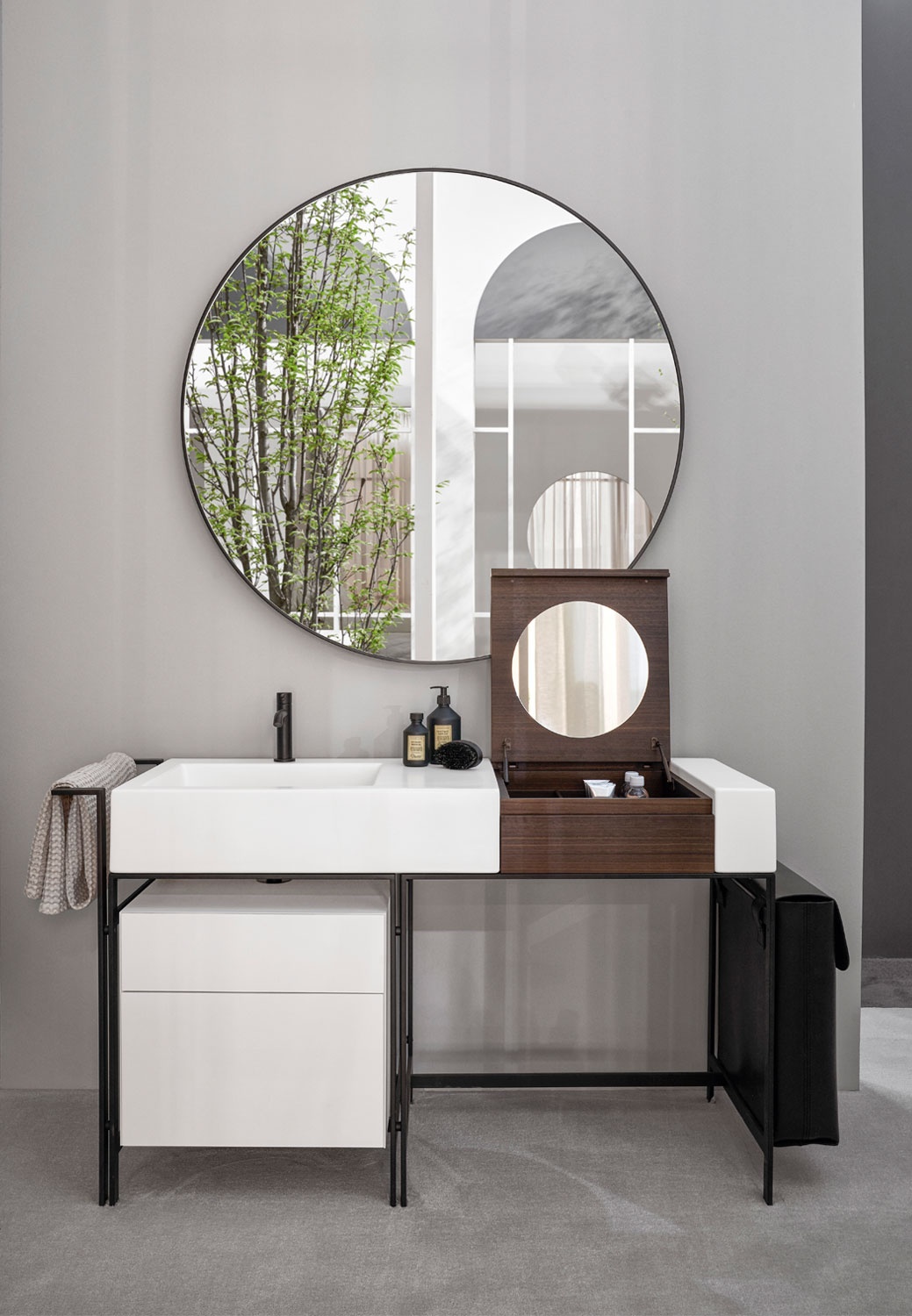 方便的洗臉盆的模塊化系統,配有多種飾面的大型側臺面,結合帶可拆卸架子的木制化妝元件,有 Terre di Cielo 顏色系列的漆飾面或覆蓋采用珍貴的天然木材飾面。涂漆鋼結構可以搭配實用的側毛巾架、漆木或木質飾面的抽屜單元以及舒適的側邊皮革袋。