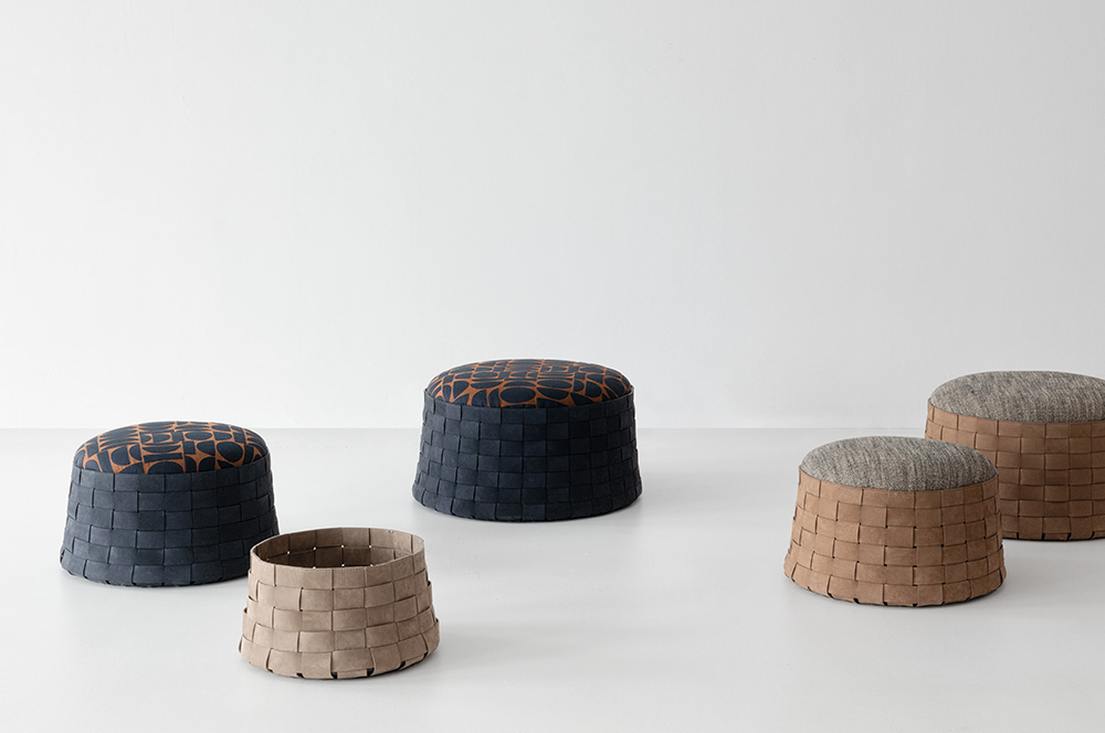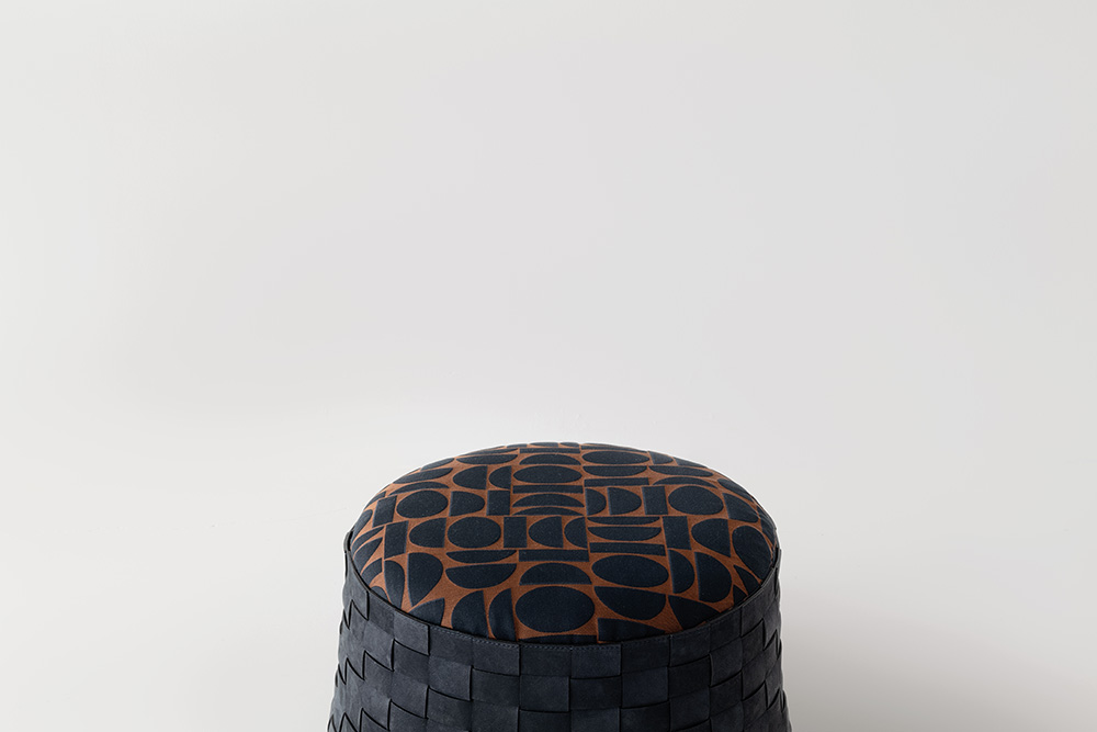 Dama seat upholstered with expanded polyurethane foam with two different densities covered with acrylic fiber. Woven leather structure with special raw cut edges finish available in three different leathers: Soffio, Setanil and Natural Velour. If no preference is specified, the edges feature tone-on-tone lacquering. The base is made of painted black wood. Dama seduta in poliuretano espanso con 2 densità rivestite con falda acrilica. Struttura in pelle intrecciata finitura cuoio, disponibile in tre tipologie di pelle: Soffio, Setanil e Natural Velour. I bordi sono realizzati tono su tono se non viene specificata alcuna preferenza. Base in legno verniciata nera.
