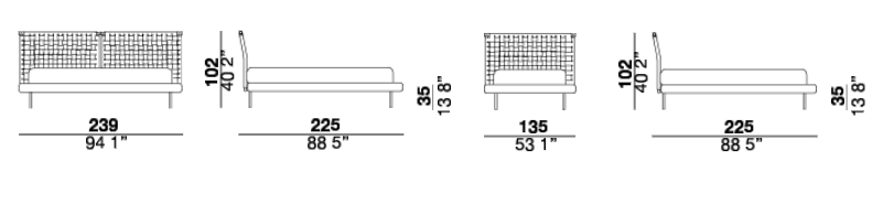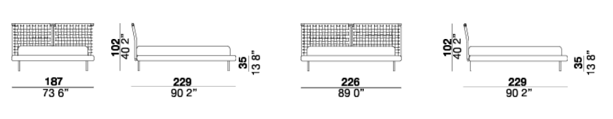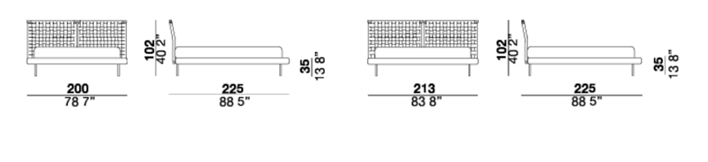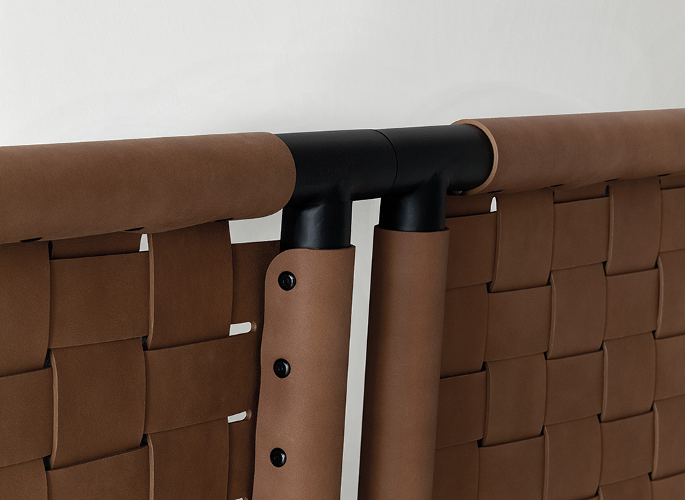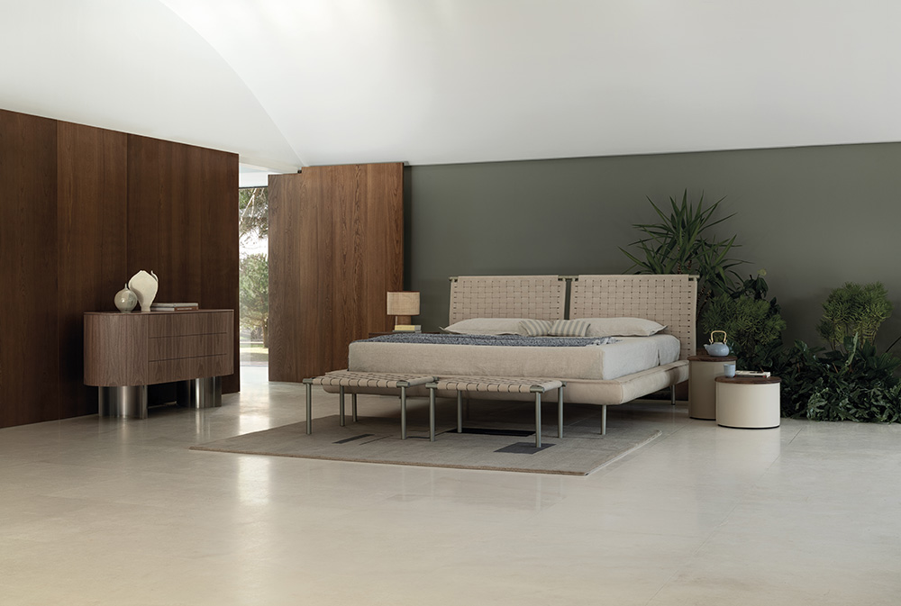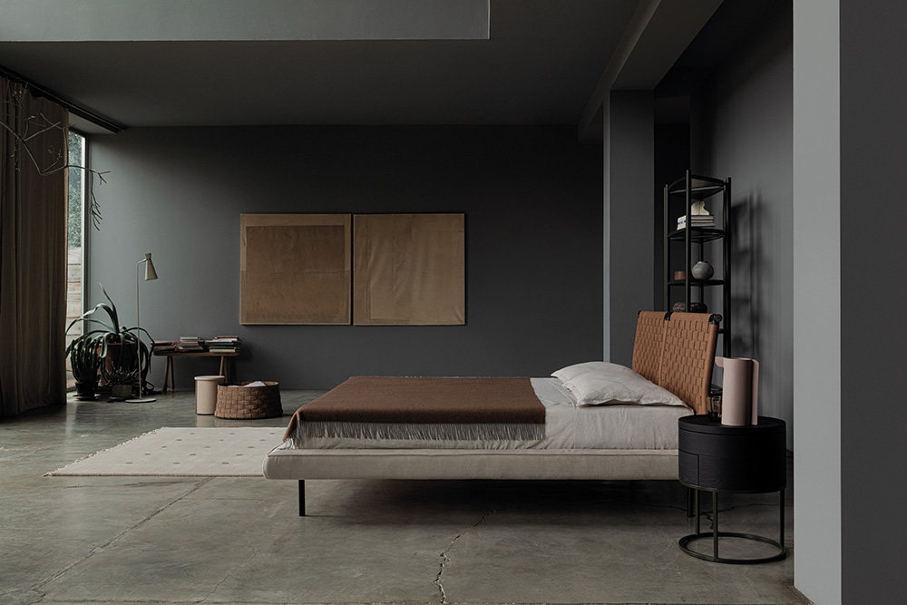 Jared bed with painted metal headboard available in two colors: Champagne and black. The headboard is decorated with woven leather with special raw cut edges finishing, available in three different leathers: Soffio, Setanil and Natural Velour. The standard finishing of headboard back-side, is made of black Romana leather, it is possible to have it in the same leather as the front with an up-charge. The wooden frame is covered with expanded polyurethane foam further covered with acrylic fiber. The metal feet are painted Champagne or black. If no preference is specified, the edges feature tone-on-tone lacquering. The matress is not included.