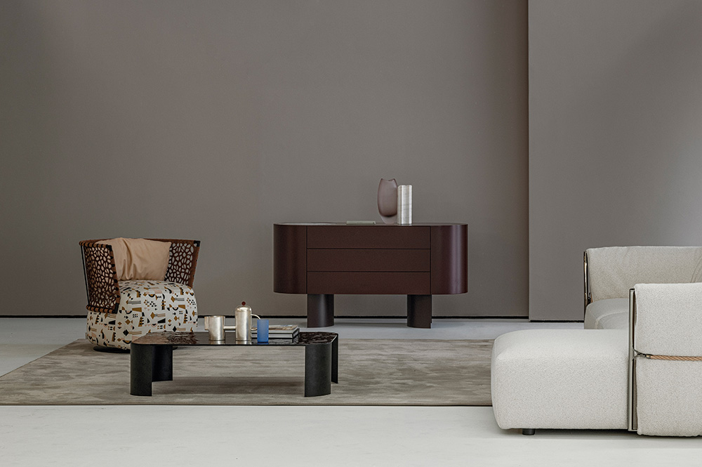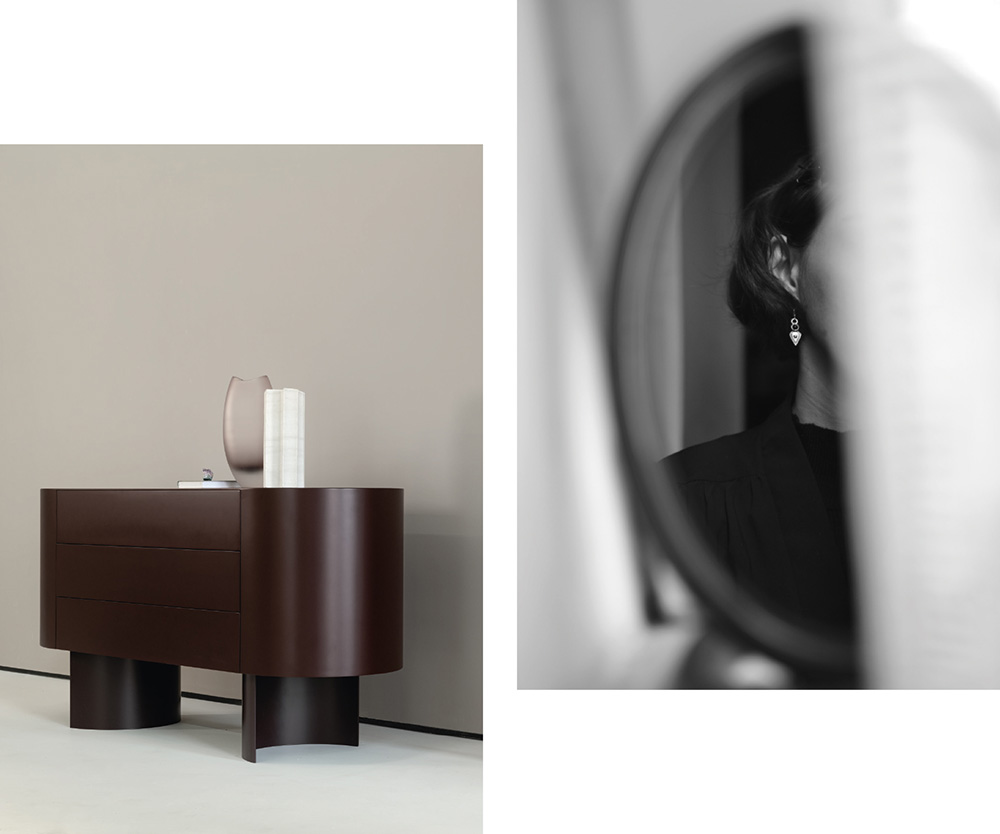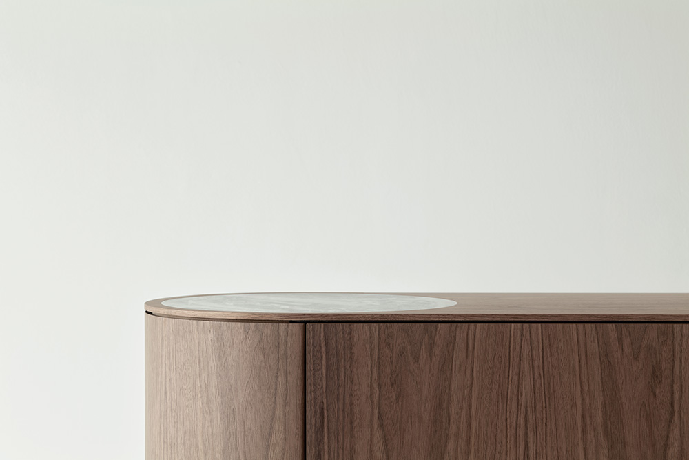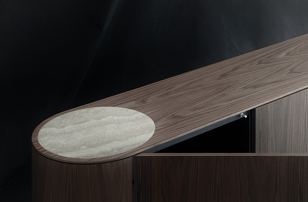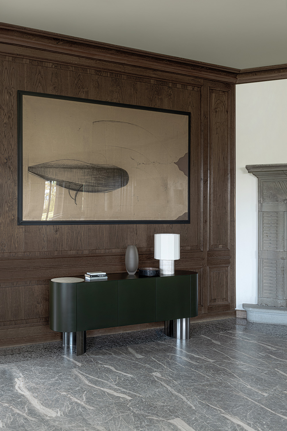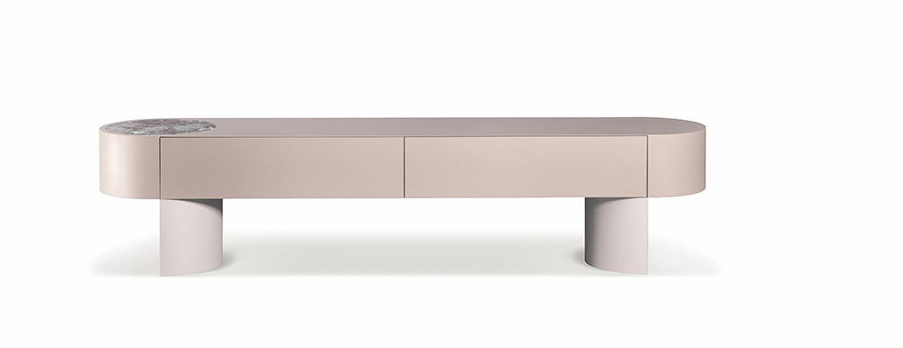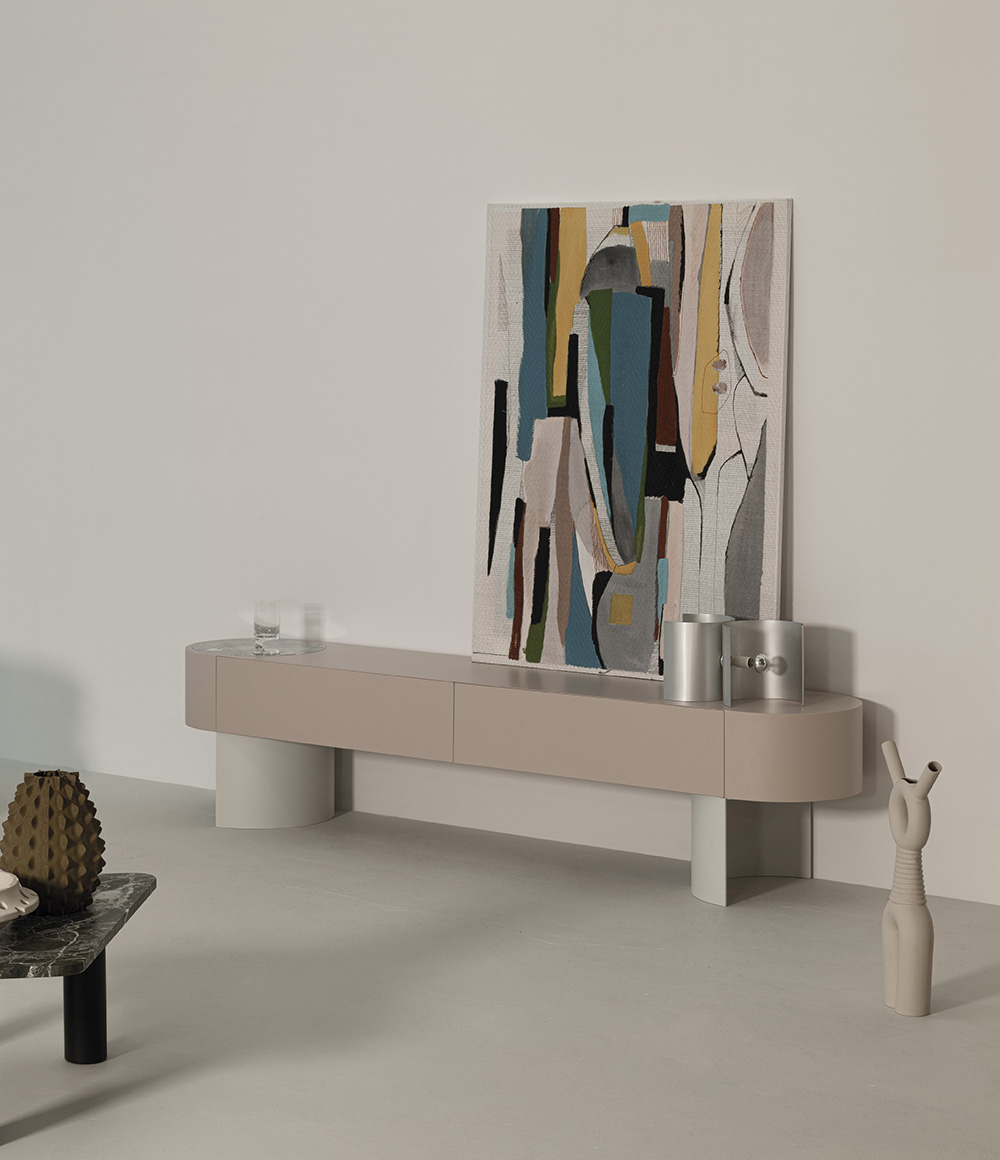 THE LARGE SUPPORTING STRUCTURE GIVES A FEELING OF HOSPITALITY, A WELCOMING ADDITION TO YOUR HOUSE. THE LIP SIDEBOARD HAS A LACQUERED BASE, AND BOTH THE INTERNAL AND EXTERNAL DESIGN INVOLVE A COMBINATION OF LINES AND CIRCLES. THE WHOLE STRUCTURE IS SUPPORTED BY ROUND ARCHES, WHILE THE SQUARE DRAWERS CONTRAST WITH THE CIRCULAR MARBLE TOP, CREATING A PARTICULAR IMPACT IN YOUR ROOM.