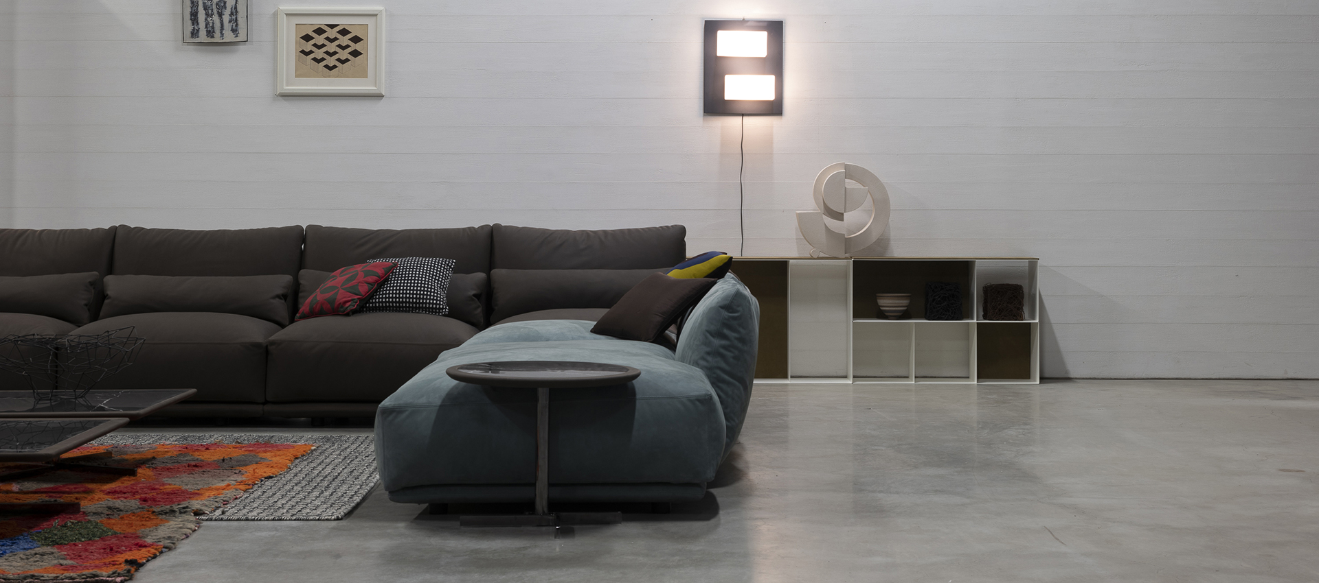 with polyurethane foam and acrylic layer. Feet in black polymer