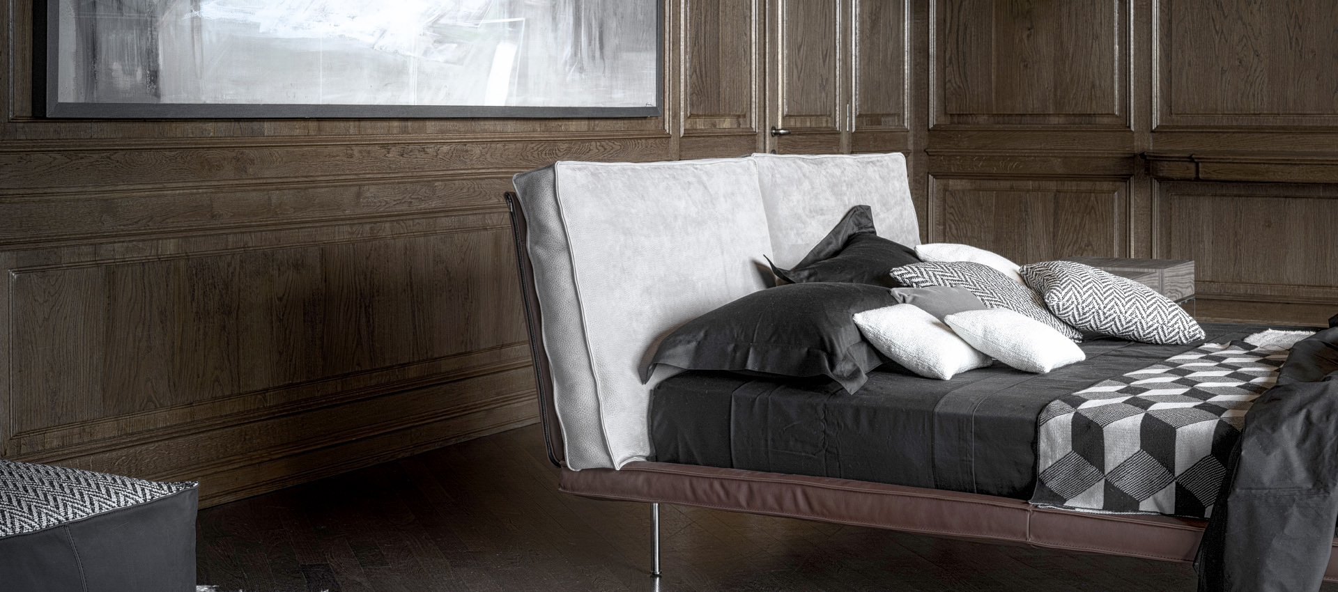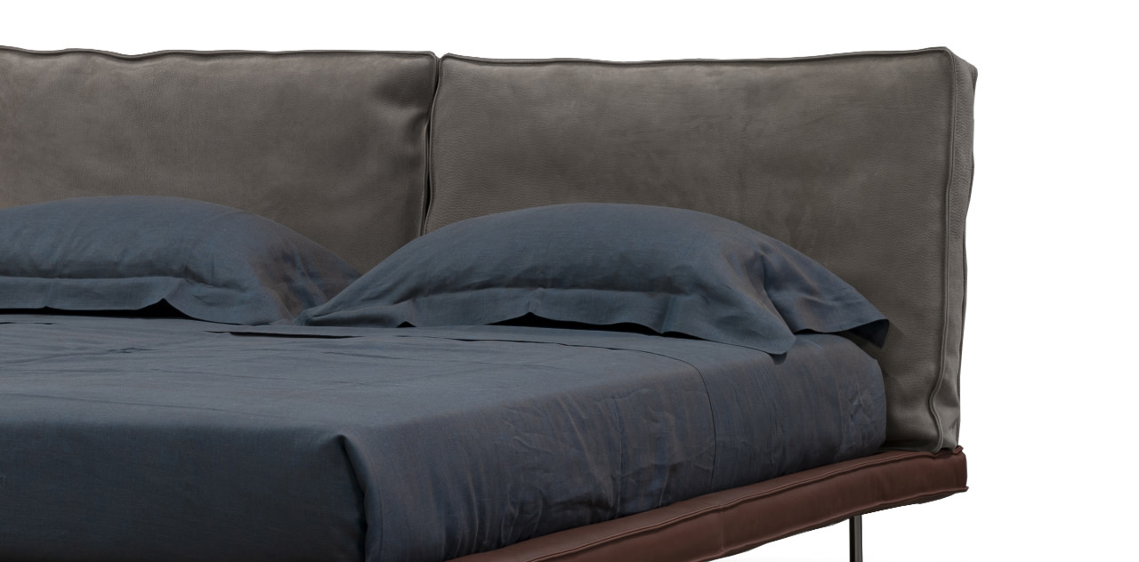 Headboard cushion in silicone-coated microfibre. The frame of the sommier is made of metal
