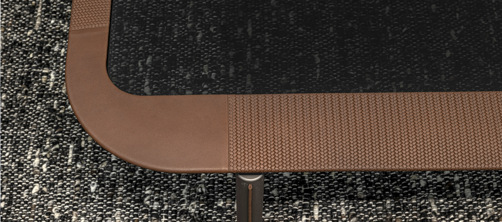 glass top surrounded by a worked leather frame. no edges for this rounded design coffee table. thin feet in painted wood with leather detail. a decidedly light and versatile line capable of combining different and complementary materials.