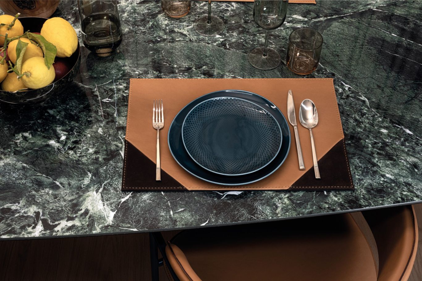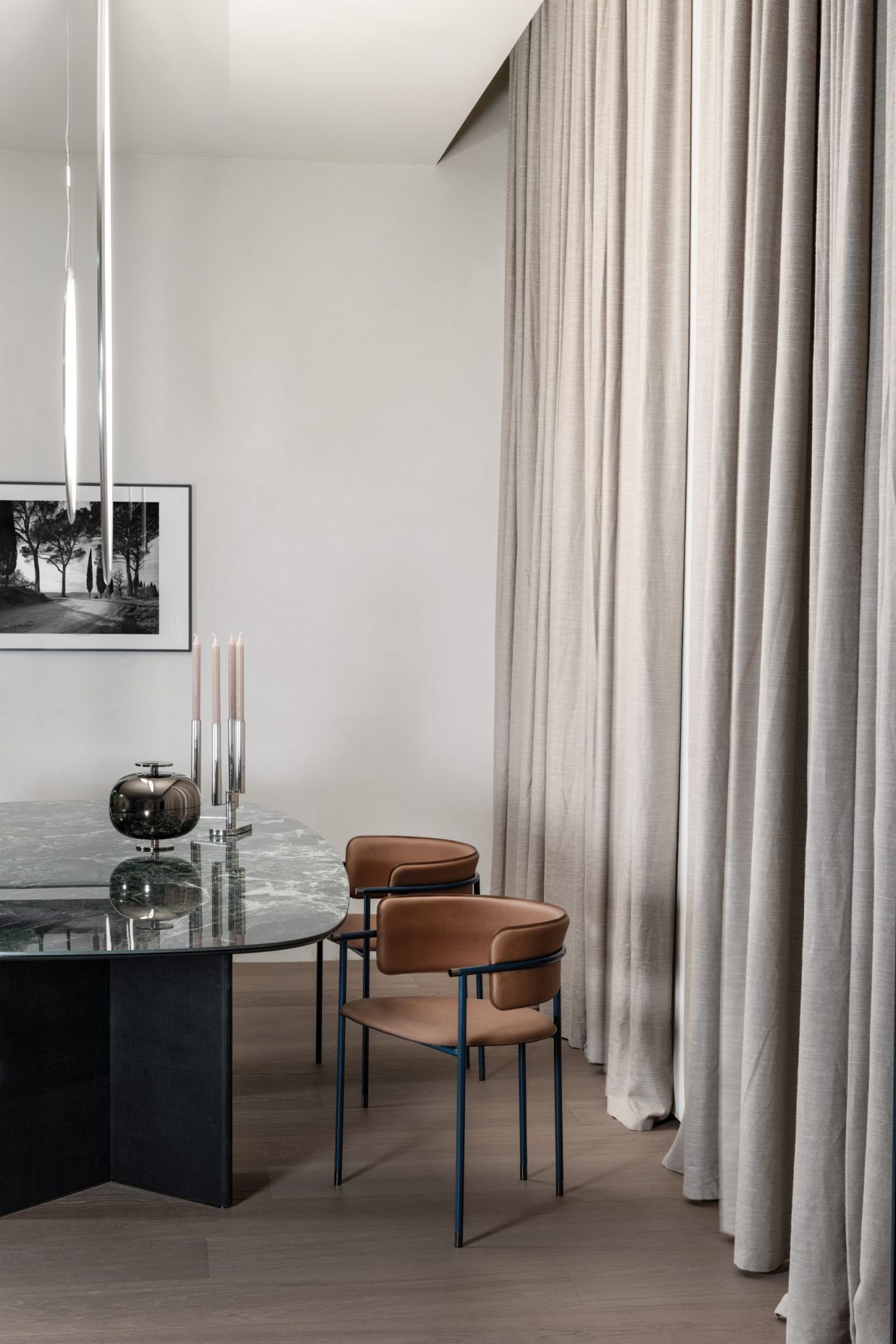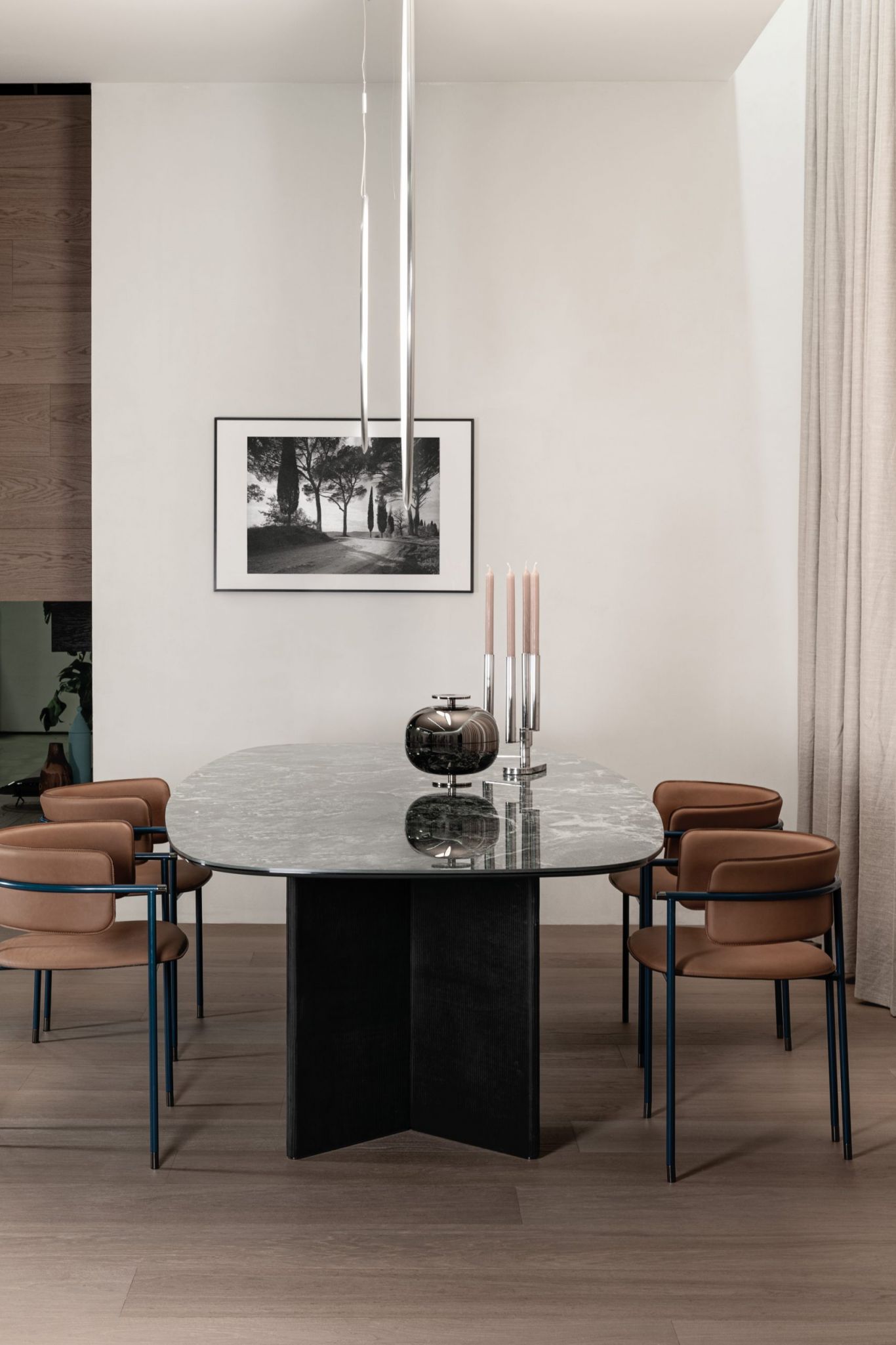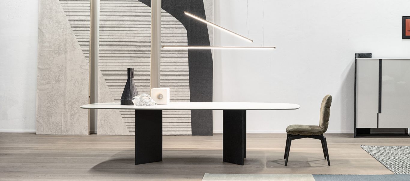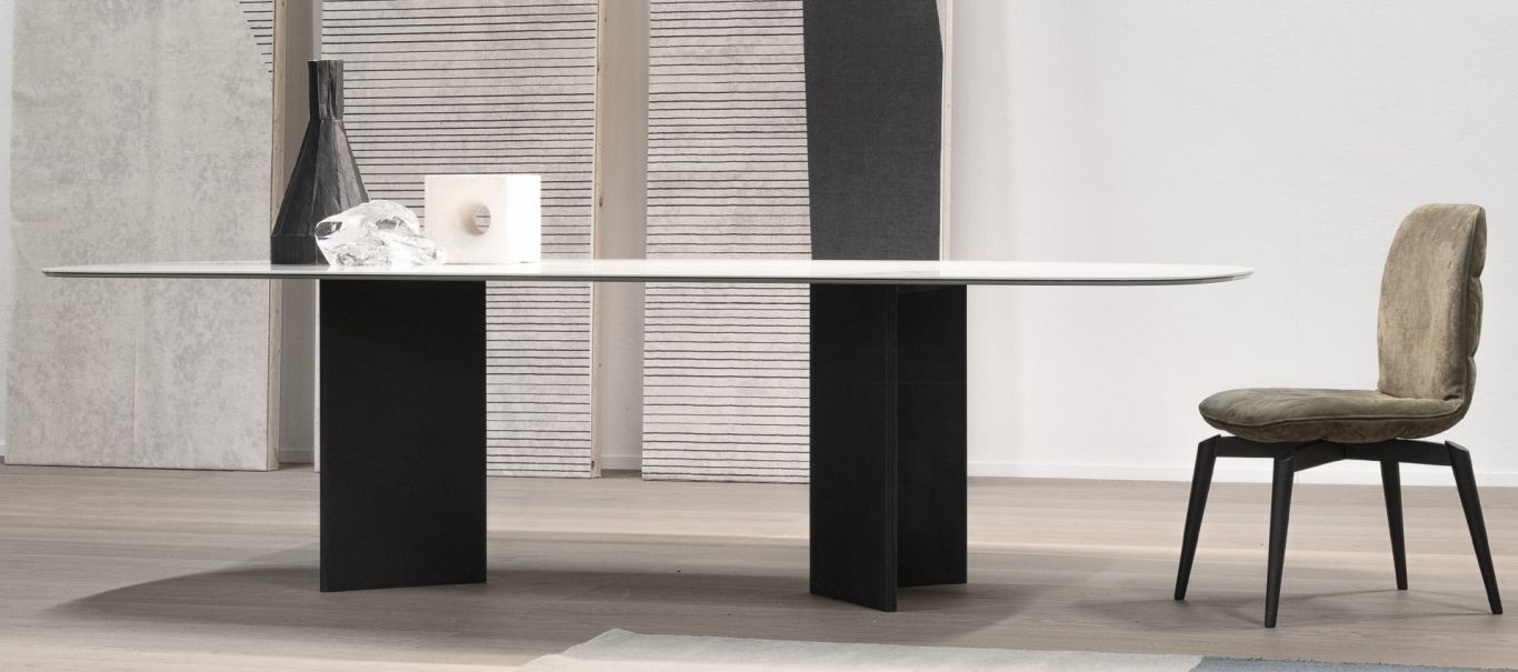 Glamour e chic. La forza del tavolo Wings è nelle due basi rivestite in pelle, ma l’eleganza è nel suo piano in effetto marmo.