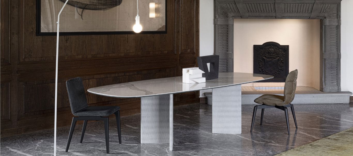 le gambe in legno accentuano lo slancio della struttura di marlon. una sedia dal design sottilmente evanescente ma stabile e confortevole che, grazie alla scocca e allo schienale imbottito, entrambi in pelle, raddoppia la sensazione di comodità.