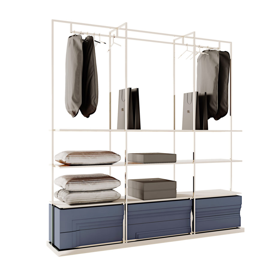 Struttura in legno multistrato laccato. Interno cassetti laccati. Struttura sovrastante e supporto per appendini in tubolare metallico. Basamento in legno massello rivestito in metallo. Ripiani in legno rivestiti in pelle o tessuto non sfoderabile con profili in metallo.
