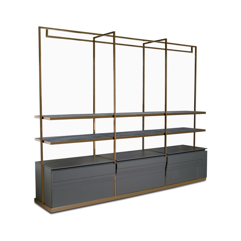 Struttura in legno multistrato rivestito esternamente in lamiera verniciata e ottone. Struttura sovrastante e supporto per appendiabiti in tubolare di ottone. Basamento in legno massello rivestito in ottone. Ripiani in legno multistrato, rivestiti in pelle o tessuto non sfoderabile con profili in ottone. Interno cassetti laccato satinato.