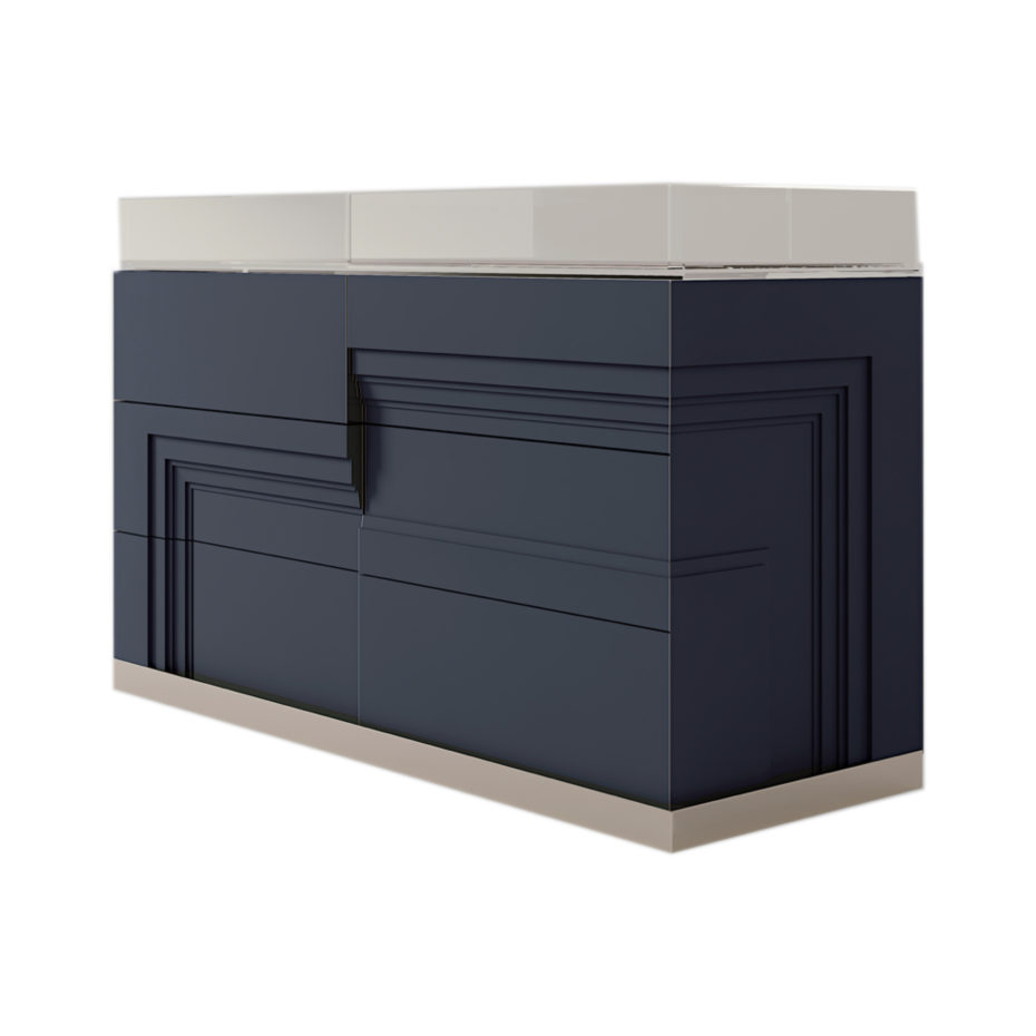 Struttura in legno listellare laccato. Interno cassetti lac- cati. Base in legno rivestito in metallo. Vetrina sul top.