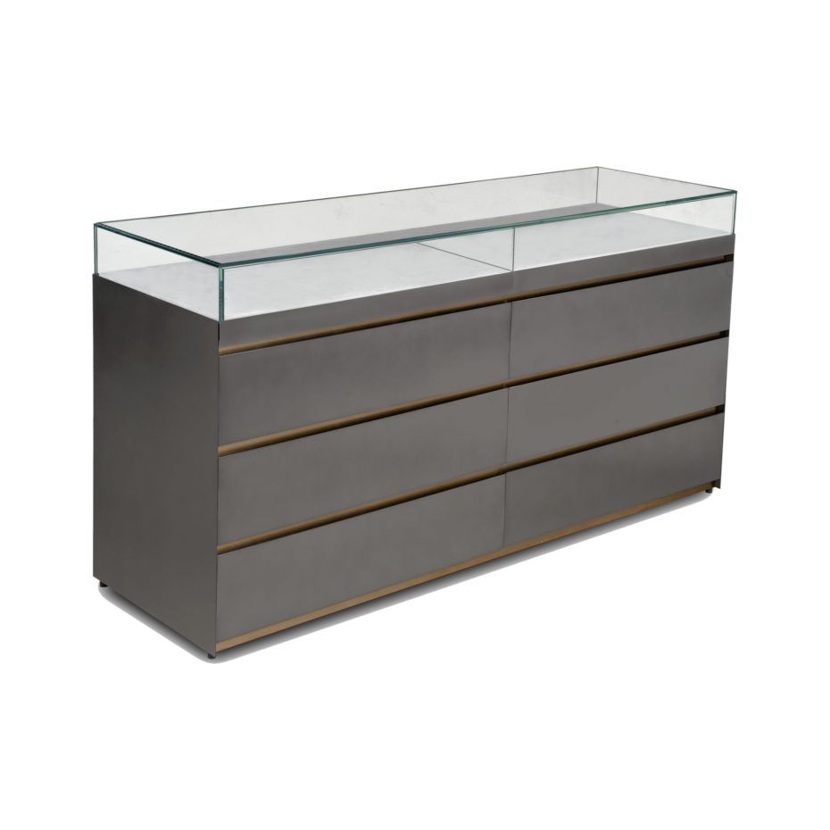 Struttura in legno rivestita esternamente in lamiera verniciata e particolari in metallo con finitura ottone. Interno cassetti laccato satinato. Vetrina sul top.