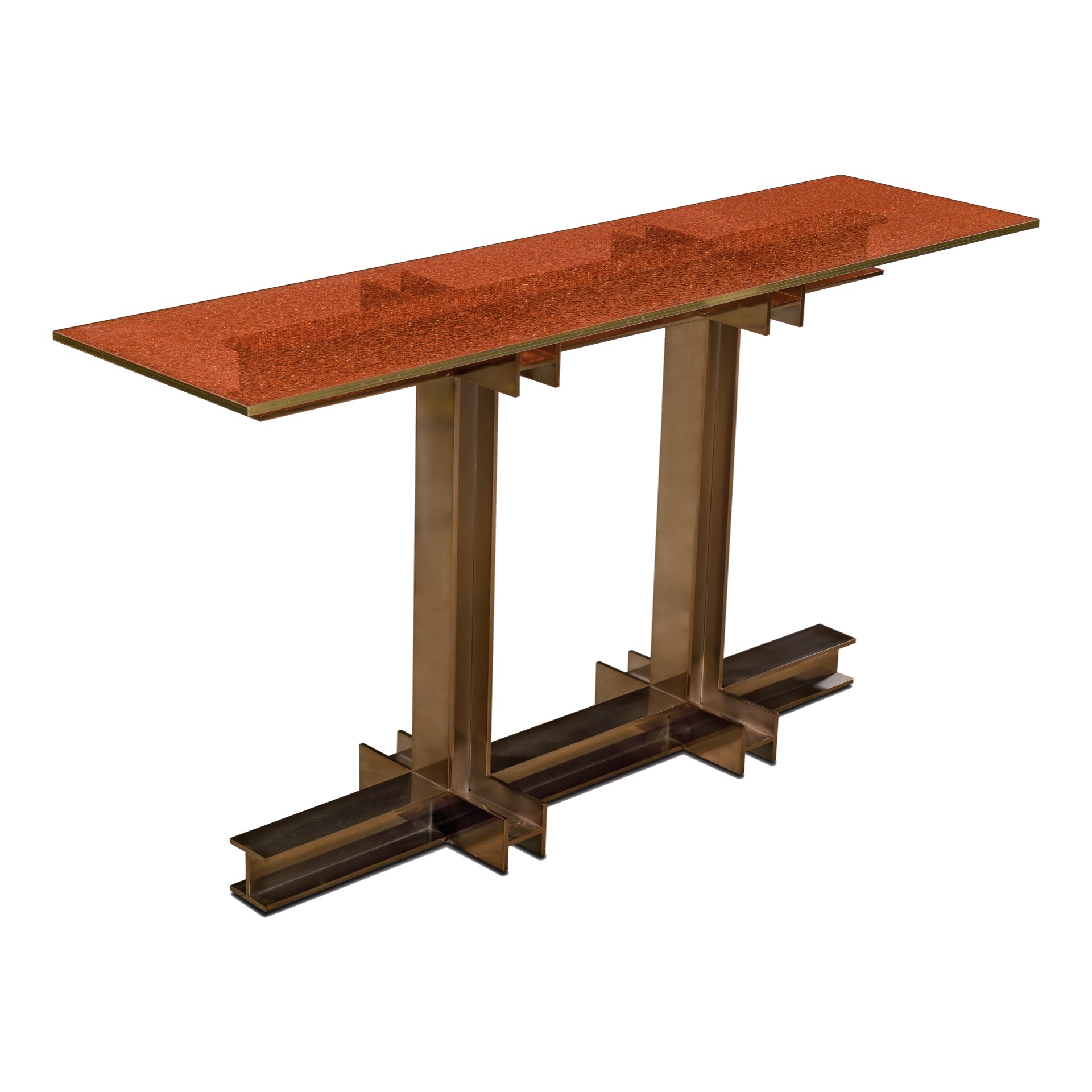 Basamento in metallo con profili IPE. Top in vetro stratificato effetto crackle con profilo laccato metallizato.