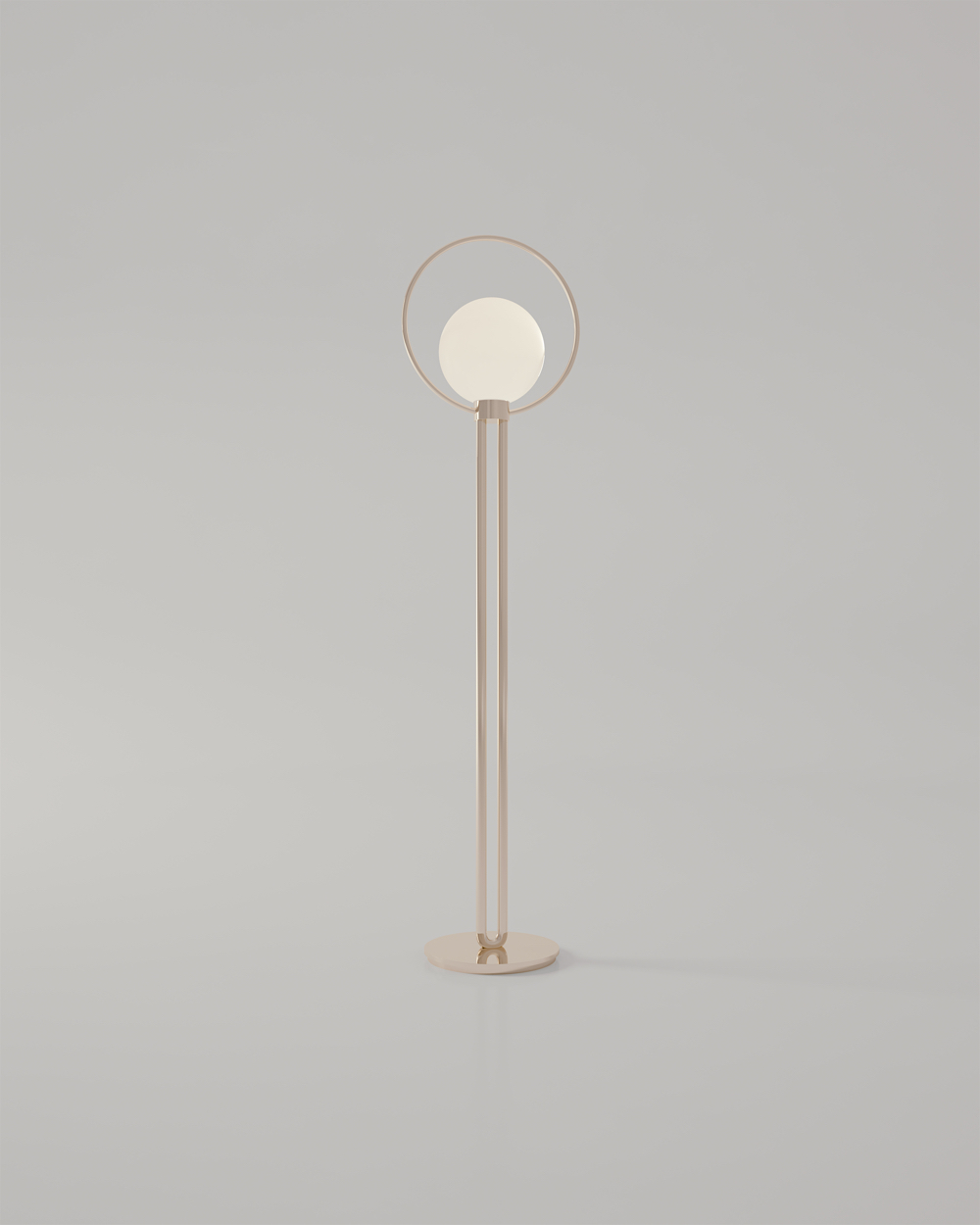 Struttura tubolare metallica. Sfera in vetro opale. Cavo in maglia metallica finitura bronzo. Lampadina LED G9 220 volt.