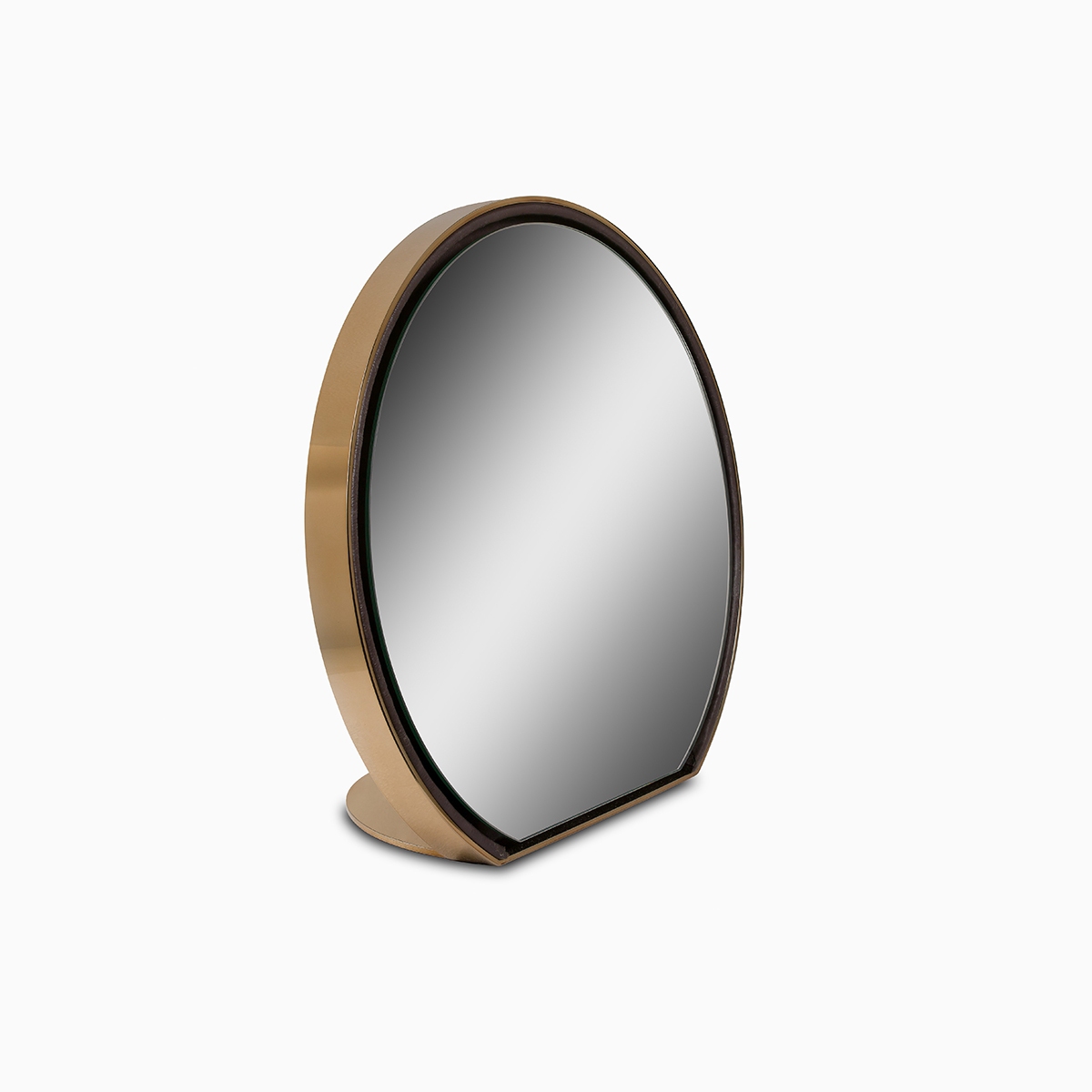 Struttura in legno con profilo e base in acciaio finitura ottone. Rivestimenti in pelle o tessuto. Led interno perimetrale. Specchio neutro frontale. Cavo in maglia metallica finitura bronzo.