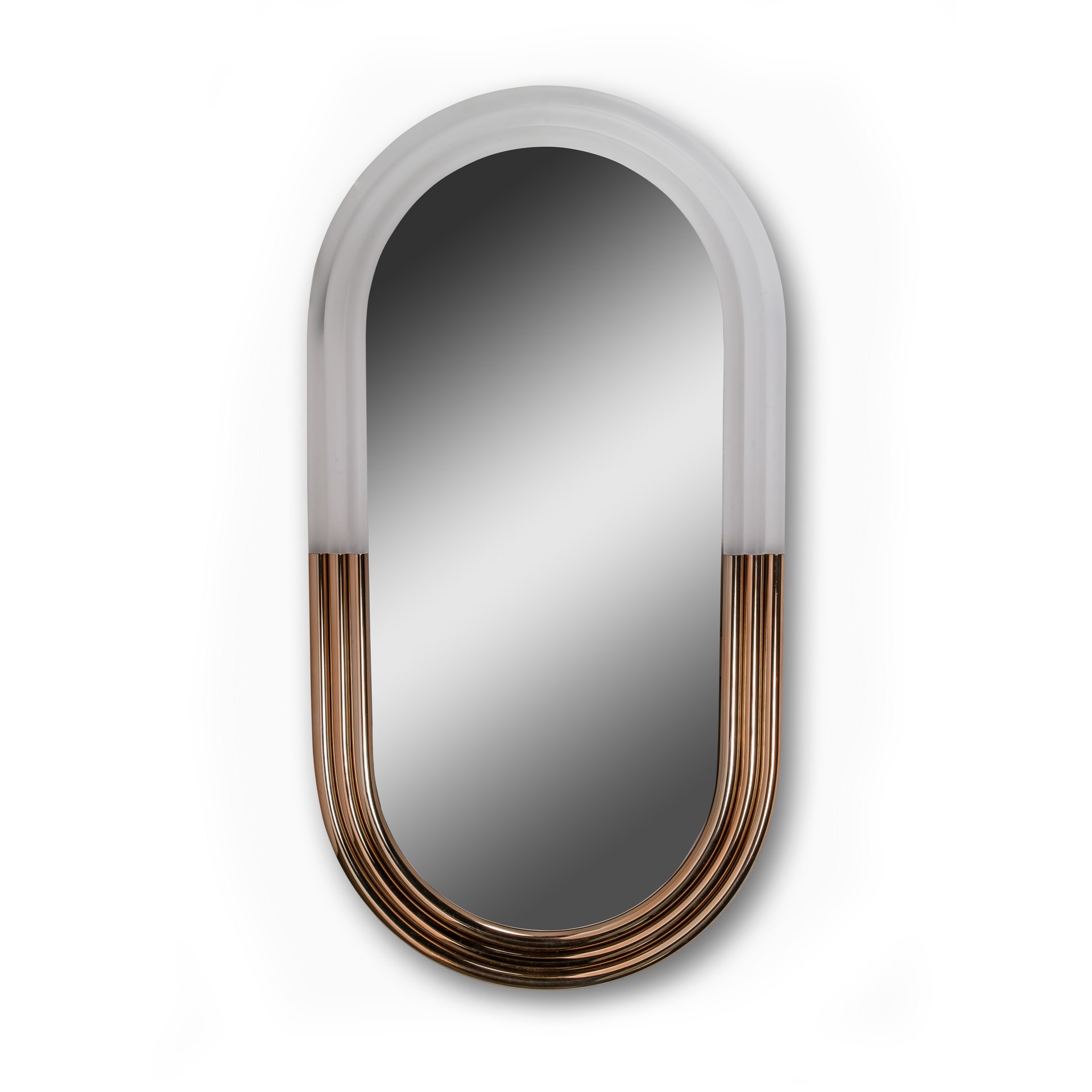 Specchio racchiuso in 3 tubolari. Parte inferiore in metallo. Parti superiori in plexiglass con illuminazione led interna.