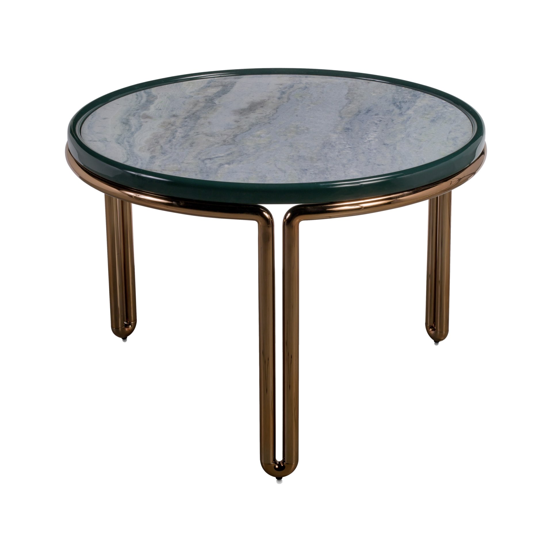 Base tubolare in metallo. Top in legno laccato con inserto in marmo o specchio.
