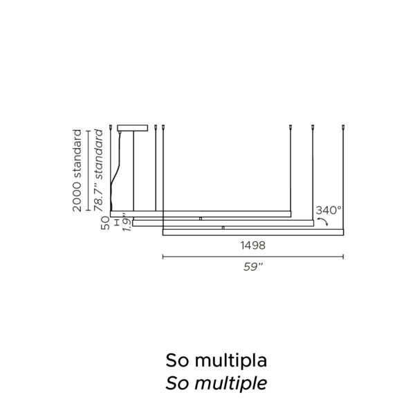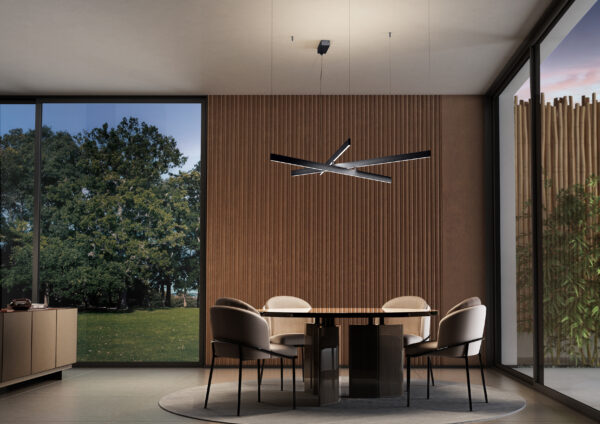 La versione a sospensione Fly Multiple permette di orientare e posizionare i bracci per creare diverse composizioni, e prevede una doppia emissione luminosa (sopra e sotto) sia per luce diretta che d'ambiente. Si fissa al soffitto in sei punti, con un ulteriore fissaggio per il rosone.