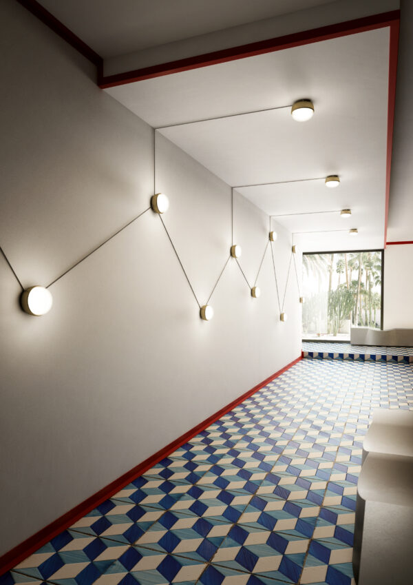 La lampada è disponibile nelle versioni da parete, da tavolo e sospensione, con struttura in metallo nelle finiture nickel dorato satinato, bronzo-nickel spazzolato, antracite o bianco, e diffusore in vetro opale bianco. Il cavo in tessuto può essere in tinta o in contrasto con il corpo illuminante, permettendo di creare pattern a parete.