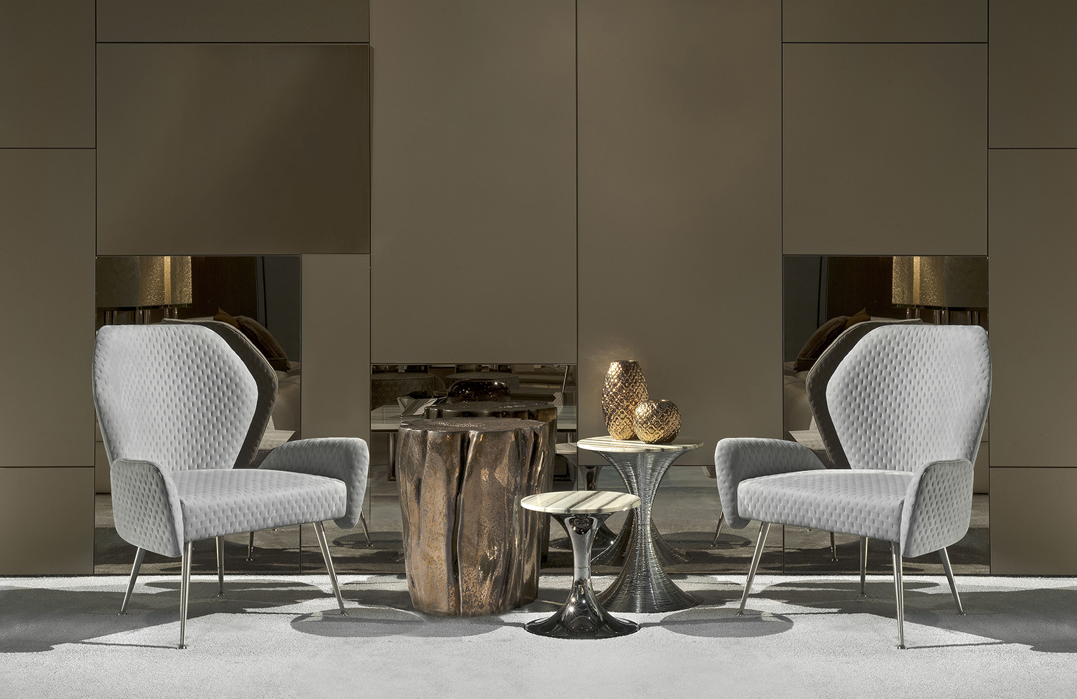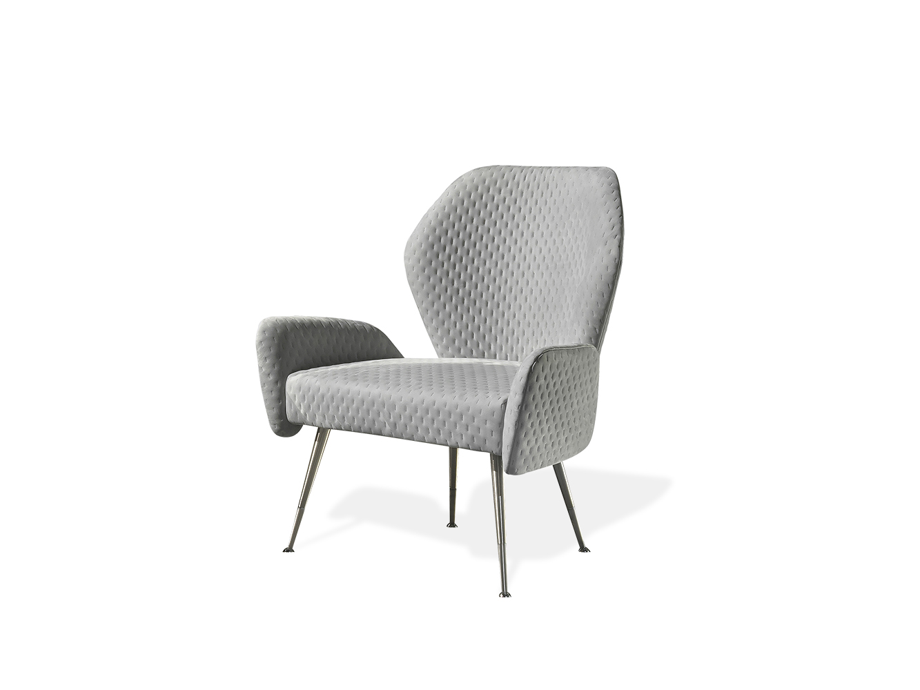 Euphoria armchair represents a perfect example of Fifties style: the backside and armrests that slightly touch the seat, convey a sense of lightness to the entire structure: the shape, embellished by a “dot” pattern embroidery, enhances three-dimensionality to the precious leathers and fabrics chosen to upholster it. The metal finish on the legs can be selected among different options.