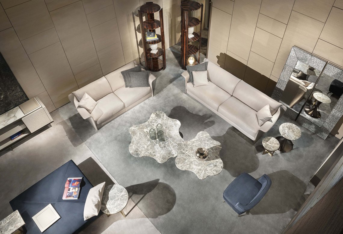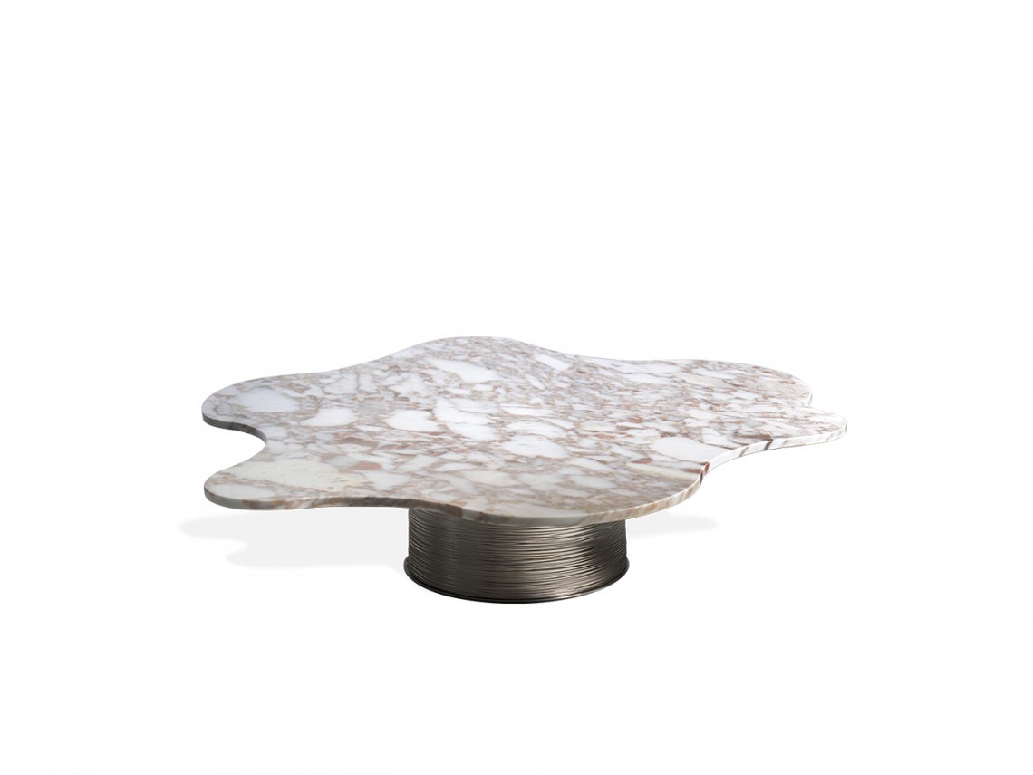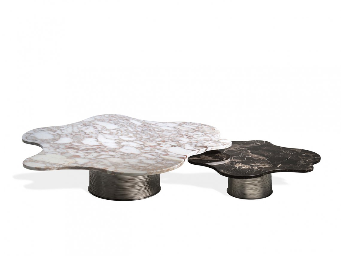 Lilia coffee tables collection represents an elegant proposal for living areas: they are suggested in different dimensions and they are recommended for a single or multiple use according to the space to furnish. These coffee tables, often composed by different marbles with similar shades, are characterized by an irregular top able to enhance elegance to the environment. The metal base engraved horizontally is proposed with different finishes.