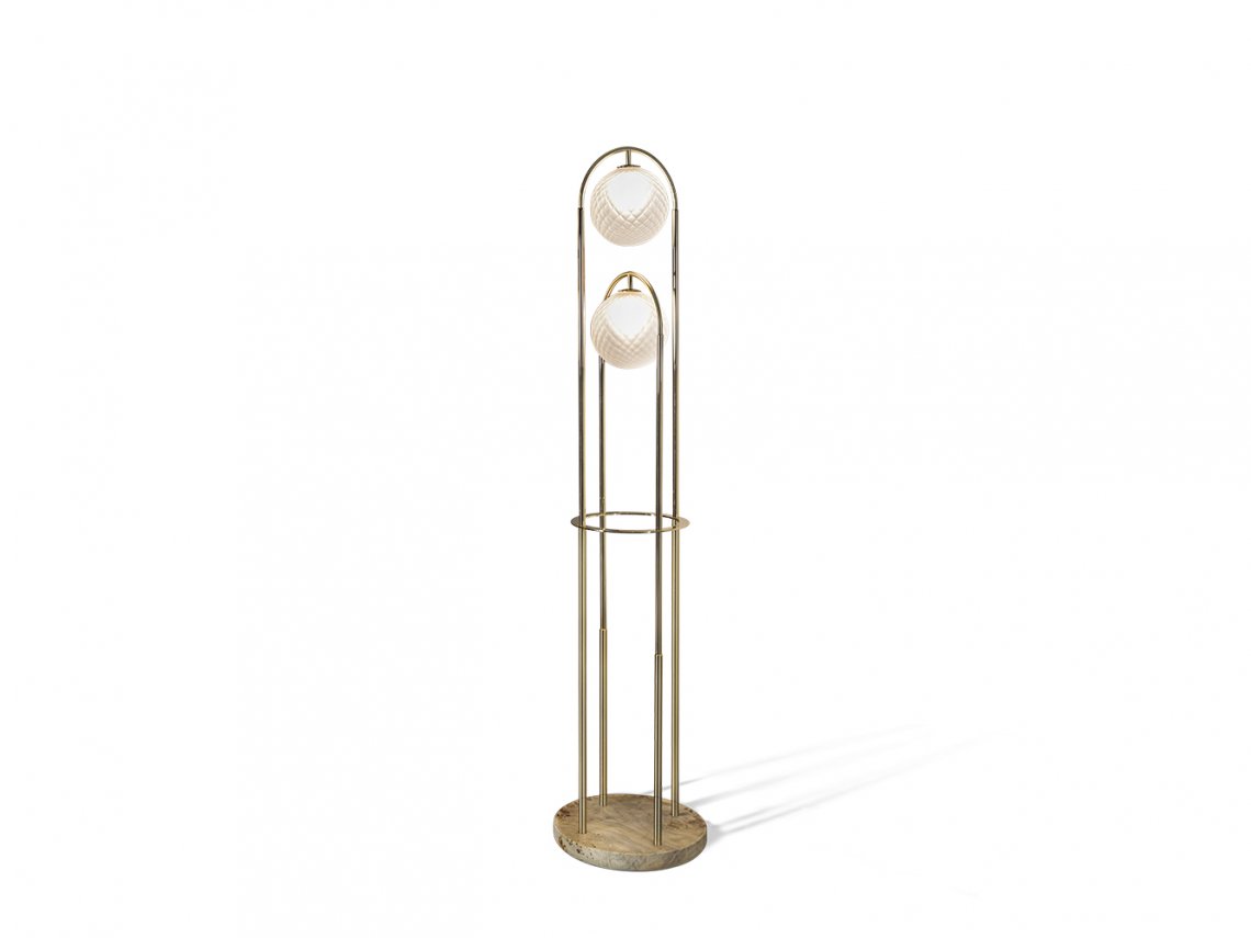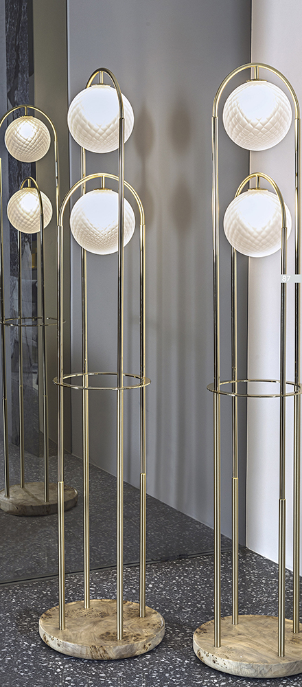 Floor lamp Heron represents and elegant solution for the most sophisticated environments. The light spreads through the blown glass spheres realized by master glassmakers of Venice area with the “Balloton” technique that creates a three-dimensional crossed pattern on the surface. The spheres are supported by two shiny and brushed metal archs of differents heights that move from the tray-shaped base in poplar root to the top.