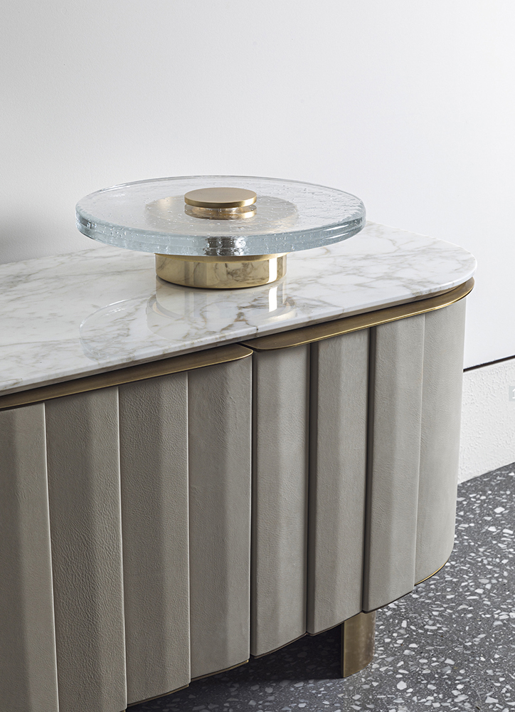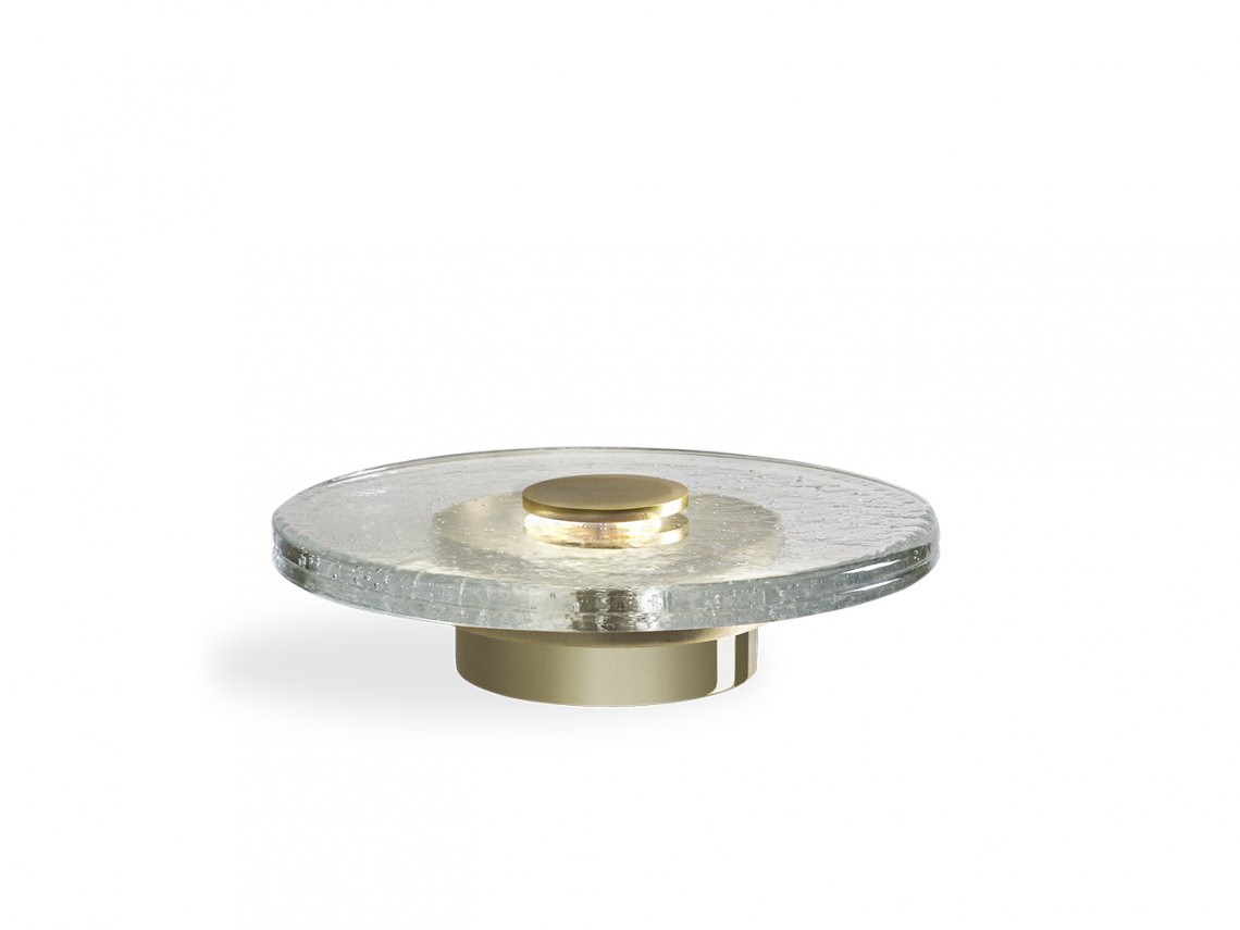 Table lamp Saturn has a refined and contemporary look where a metal support is enriched by a “pulegoso” glass disk with a great thickness, obtained thanks to the casting-in-plates technique. This working process dates back to the beginning of Twentieth Century and it helps to obtain a glass full of little bubbles whose result depends on the skills of the artisans that create unique pieces. The designer took inspiration from this technique because it can exalt the extraordinary beauty of the glass crossed by the light rays. The intensity of the light can be adjusted thanks to a touch system placed on the metal insert above the glass disk.