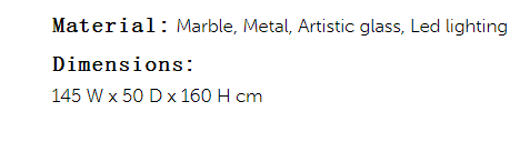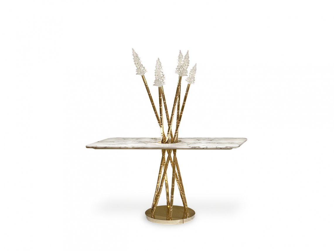 In Lewis console a bundle of metal pipes that ends up with handmade glass points crosses a precious marble top: the glass points, realized by master glassmakers in Venice area, are enlightened by leds placed inside of metal pipes. More than a piece of furniture this exclusive element is able to enhance a great atmosphere in a refined and elegant environment.
