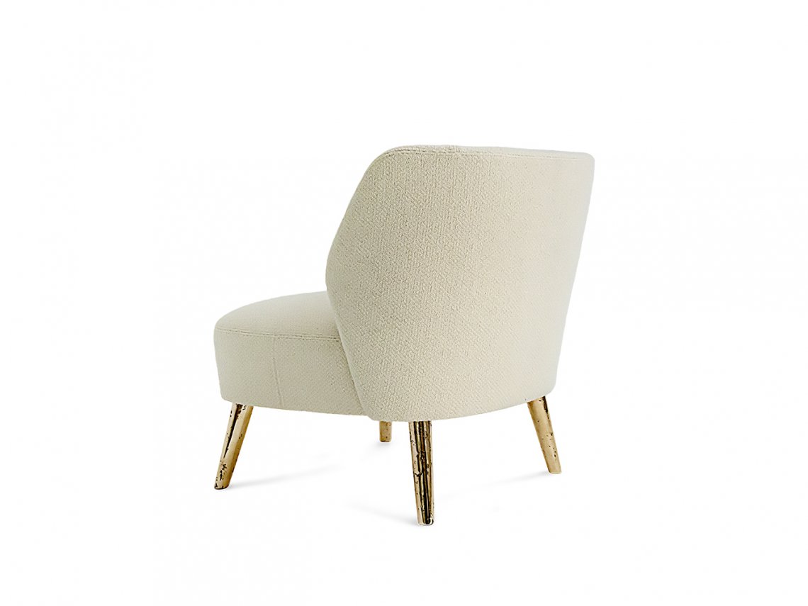 The enveloping and comfortable armchair Marilou can be upholstered only with selected textured fabrics. The backside is characterized by a quilting embroidered with hexagonal design. The bronze metal legs are realized with the ancient sand casting technique that conveys an artistic touch to the armchair.