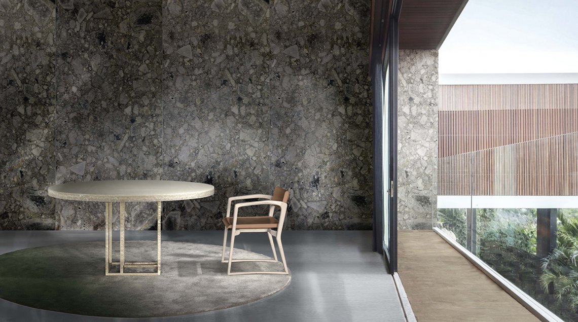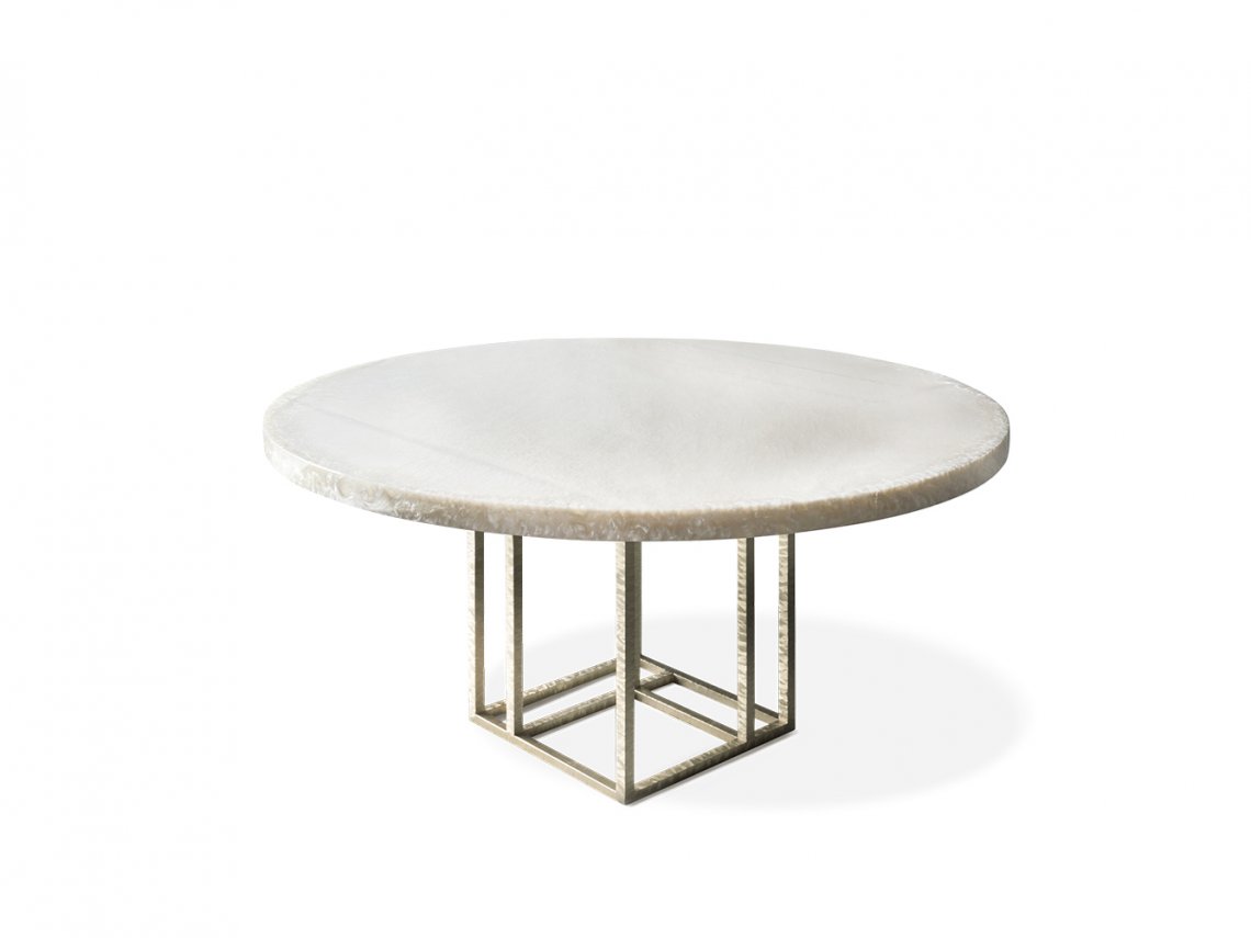 The tables of Lineup collection are available in round and rectangular shape, both in several different sizes. The skillful manual method of metal engraving is inspired by the working techniques of Italian premium class jewelry. The essential and rigorous metal structure creates a harmonious contrast with the top, realized with a decorative finish composed of resins, coloured pigments and natural elements. The extraordinary decorative strength of this table with geometric lines perfectly fits a contemporary dining area.